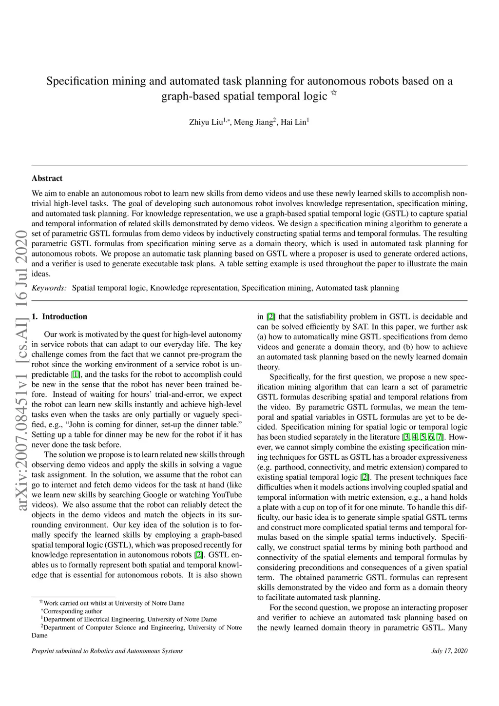 We aim to enable an autonomous robot to learn new skills from demo videos and use these newly learned skills to accomplish non-trivial high-level tasks. The goal of developing such autonomous robot involves knowledge representation, specification mining, and automated task planning. For knowledge representation, we use a graph-based spatial temporal logic (GSTL) to capture spatial and temporal information of related skills demonstrated by demo videos. We design a specification mining algorithm to generate a set of parametric GSTL formulas from demo videos by inductively constructing spatial terms and temporal formulas. The resulting parametric GSTL formulas from specification mining serve as a domain theory, which is used in automated task planning for autonomous robots. We propose an automatic task planning based on GSTL where a proposer is used to generate ordered actions, and a verifier is used to generate executable task plans. A table setting example is used throughout the paper to illustrate the main ideas.