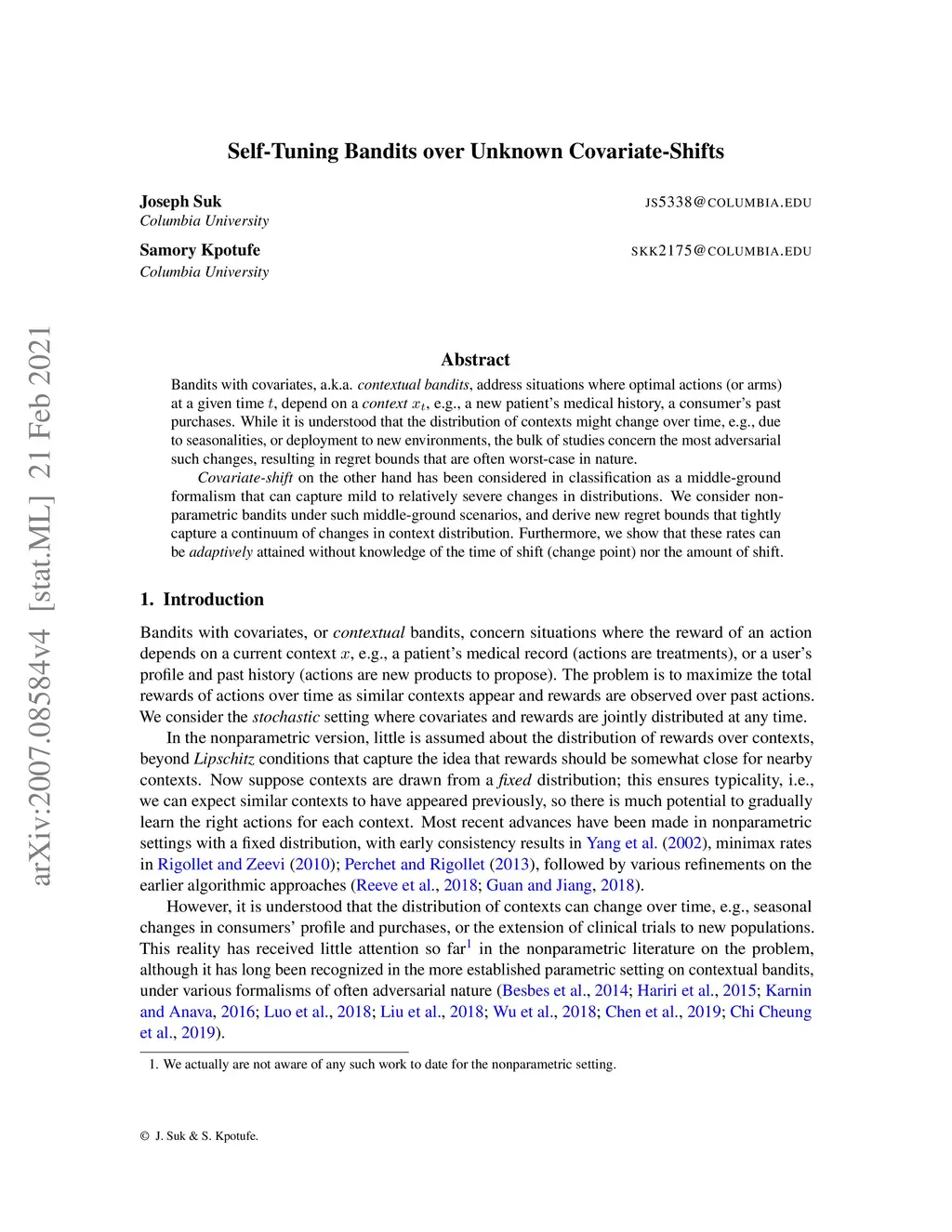 Bandits with covariates, a.k.a. contextual bandits, address situations where optimal actions (or arms) at a given time , depend on a context , e.g., a new patient's medical history, a consumer's past purchases. While it is understood that the distribution of contexts might change over time, e.g., due to seasonalities, or deployment to new environments, the bulk of studies concern the most adversarial such changes, resulting in regret bounds that are often worst-case in nature. Covariate-shift on the other hand has been considered in classification as a middle-ground formalism that can capture mild to relatively severe changes in distributions. We consider nonparametric bandits under such middle-ground scenarios, and derive new regret bounds that tightly capture a continuum of changes in context distribution. Furthermore, we show that these rates can be adaptively attained without knowledge of the time of shift nor the amount of shift.
