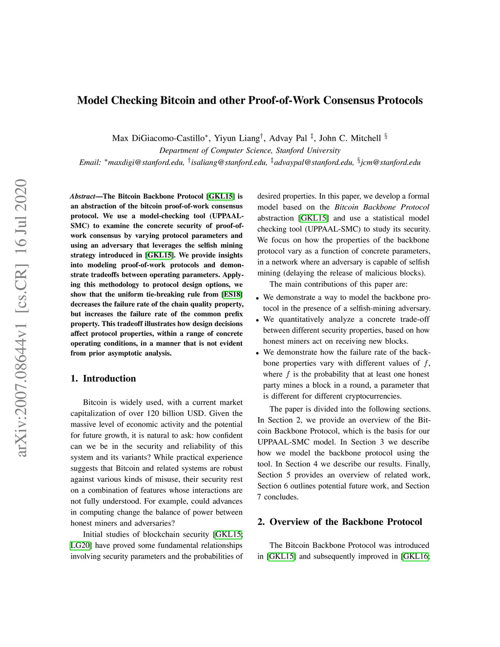 The Bitcoin Backbone Protocol [GKL15] is an abstraction of the bitcoin proof-of-work consensus protocol. We use a model-checking tool (UPPAALSMC) to examine the concrete security of proof-ofwork consensus by varying protocol parameters and using an adversary that leverages the selfish mining strategy introduced in [GKL15]. We provide insights into modeling proof-of-work protocols and demonstrate tradeoffs between operating parameters. Applying this methodology to protocol design options, we show that the uniform tie-breaking rule from [ES18] decreases the failure rate of the chain quality property, but increases the failure rate of the common prefix property. This tradeoff illustrates how design decisions affect protocol properties, within a range of concrete operating conditions, in a manner that is not evident from prior asymptotic analysis.