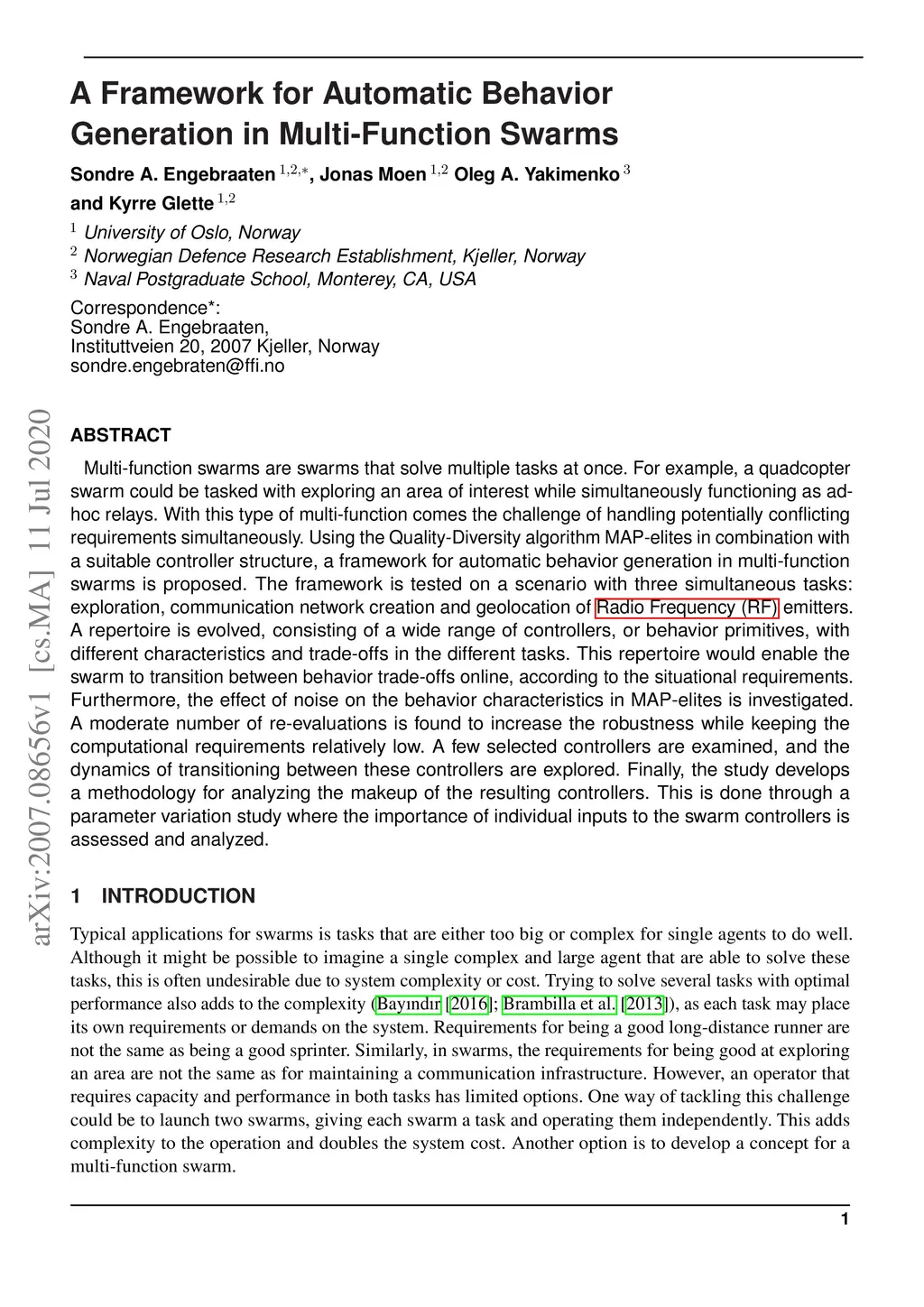 Multi-function swarms are swarms that solve multiple tasks at once. For example, a quadcopter swarm could be tasked with exploring an area of interest while simultaneously functioning as ad-hoc relays. With this type of multi-function comes the challenge of handling potentially conflicting requirements simultaneously. Using the Quality-Diversity algorithm MAP-elites in combination with a suitable controller structure, a framework for automatic behavior generation in multi-function swarms is proposed. The framework is tested on a scenario with three simultaneous tasks: exploration, communication network creation and geolocation of RF emitters. A repertoire is evolved, consisting of a wide range of controllers, or behavior primitives, with different characteristics and trade-offs in the different tasks. This repertoire would enable the swarm to transition between behavior trade-offs online, according to the situational requirements. Furthermore, the effect of noise on the behavior characteristics in MAP-elites is investigated. A moderate number of re-evaluations is found to increase the robustness while keeping the computational requirements relatively low. A few selected controllers are examined, and the dynamics of transitioning between these controllers are explored. Finally, the study develops a methodology for analyzing the makeup of the resulting controllers. This is done through a parameter variation study where the importance of individual inputs to the swarm controllers is assessed and analyzed.