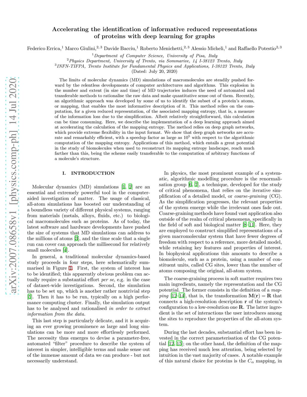 The limits of molecular dynamics (MD) simulations of macromolecules are steadily pushed forward by the relentless developments of computer architectures and algorithms. This explosion in the number and extent (in size and time) of MD trajectories induces the need of automated and transferable methods to rationalise the raw data and make quantitative sense out of them. Recently, an algorithmic approach was developed by some of us to identify the subset of a protein's atoms, or mapping, that enables the most informative description of it. This method relies on the computation, for a given reduced representation, of the associated mapping entropy, that is, a measure of the information loss due to the simplification. Albeit relatively straightforward, this calculation can be time consuming. Here, we describe the implementation of a deep learning approach aimed at accelerating the calculation of the mapping entropy. The method relies on deep graph networks, which provide extreme flexibility in the input format. We show that deep graph networks are accurate and remarkably efficient, with a speedup factor as large as with respect to the algorithmic computation of the mapping entropy. Applications of this method, which entails a great potential in the study of biomolecules when used to reconstruct its mapping entropy landscape, reach much farther than this, being the scheme easily transferable to the computation of arbitrary functions of a molecule's structure.