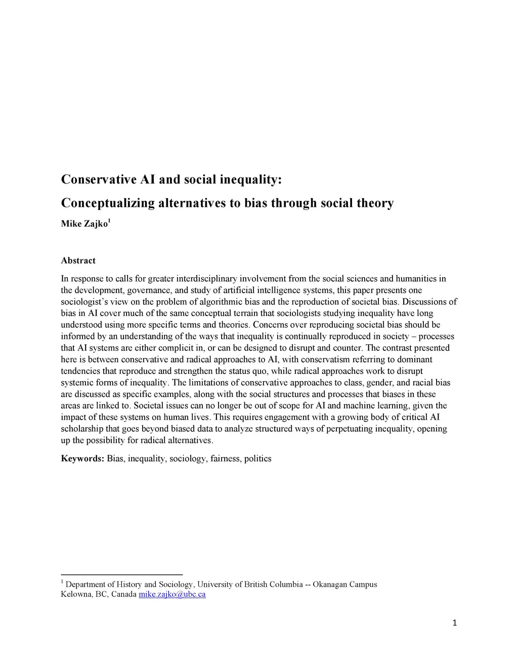 In response to calls for greater interdisciplinary involvement from the social sciences and humanities in the development, governance, and study of artificial intelligence systems, this paper presents one sociologist's view on the problem of algorithmic bias and the reproduction of societal bias. Discussions of bias in AI cover much of the same conceptual terrain that sociologists studying inequality have long understood using more specific terms and theories. Concerns over reproducing societal bias should be informed by an understanding of the ways that inequality is continually reproduced in society -- processes that AI systems are either complicit in, or can be designed to disrupt and counter. The contrast presented here is between conservative and radical approaches to AI, with conservatism referring to dominant tendencies that reproduce and strengthen the status quo, while radical approaches work to disrupt systemic forms of inequality. The limitations of conservative approaches to class, gender, and racial bias are discussed as specific examples, along with the social structures and processes that biases in these areas are linked to. Societal issues can no longer be out of scope for AI and machine learning, given the impact of these systems on human lives. This requires engagement with a growing body of critical AI scholarship that goes beyond biased data to analyze structured ways of perpetuating inequality, opening up the possibility for radical alternatives.