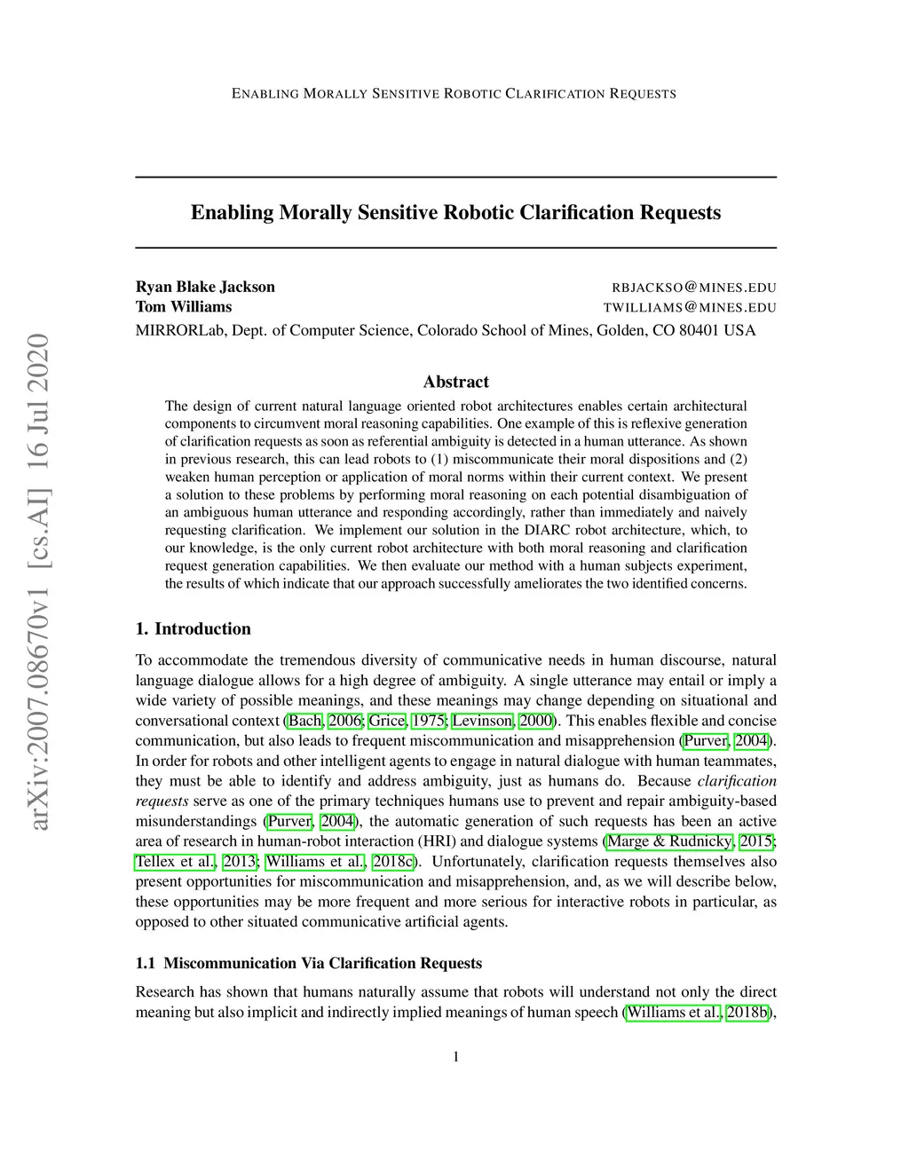The design of current natural language oriented robot architectures enables certain architectural components to circumvent moral reasoning capabilities. One example of this is reflexive generation of clarification requests as soon as referential ambiguity is detected in a human utterance. As shown in previous research, this can lead robots to (1) miscommunicate their moral dispositions and (2) weaken human perception or application of moral norms within their current context. We present a solution to these problems by performing moral reasoning on each potential disambiguation of an ambiguous human utterance and responding accordingly, rather than immediately and naively requesting clarification. We implement our solution in the DIARC robot architecture, which, to our knowledge, is the only current robot architecture with both moral reasoning and clarification request generation capabilities. We then evaluate our method with a human subjects experiment, the results of which indicate that our approach successfully ameliorates the two identified concerns.