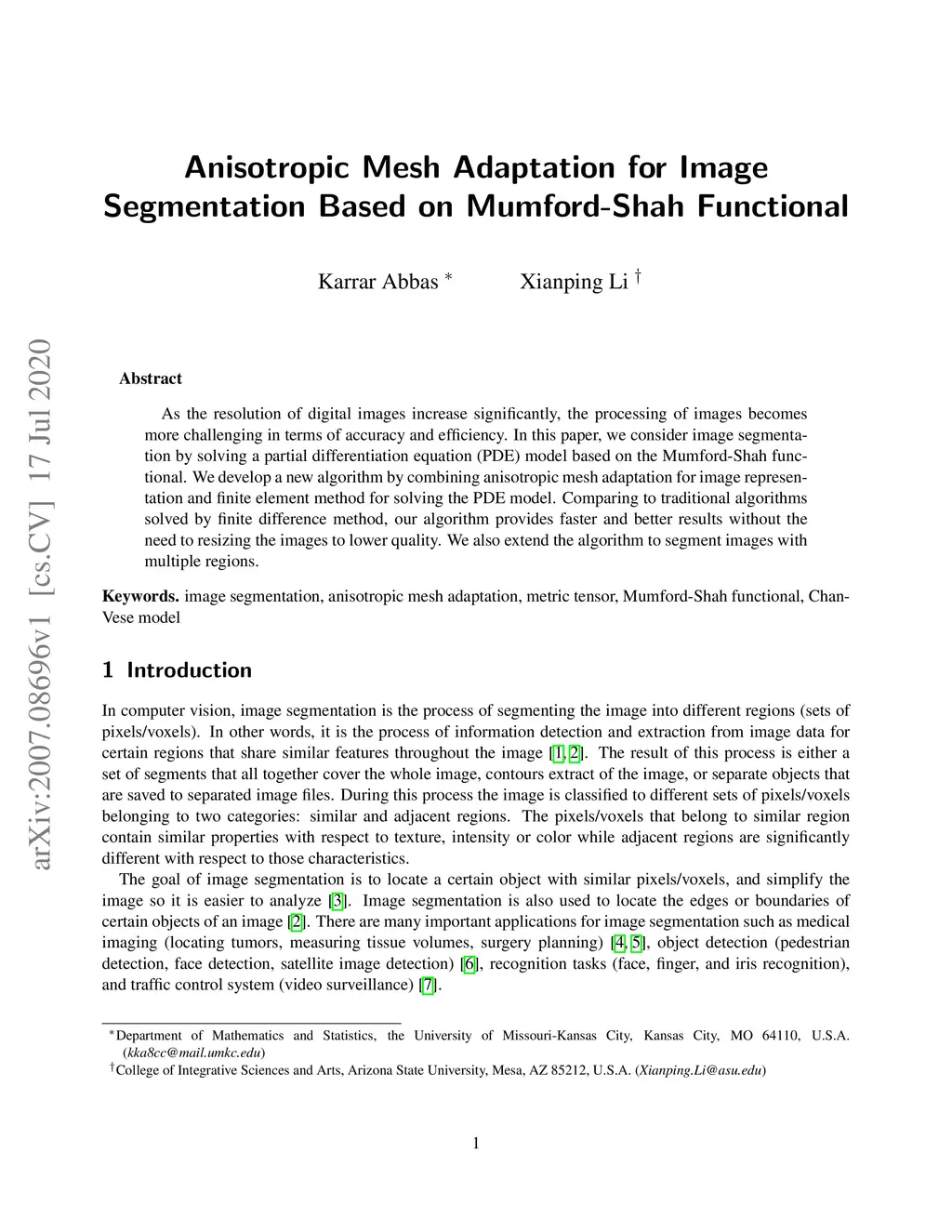 As the resolution of digital images increase significantly, the processing of images becomes more challenging in terms of accuracy and efficiency. In this paper, we consider image segmentation by solving a partial differentiation equation (PDE) model based on the Mumford-Shah functional. We develop a new algorithm by combining anisotropic mesh adaptation for image representation and finite element method for solving the PDE model. Comparing to traditional algorithms solved by finite difference method, our algorithm provides faster and better results without the need to resizing the images to lower quality. We also extend the algorithm to segment images with multiple regions.