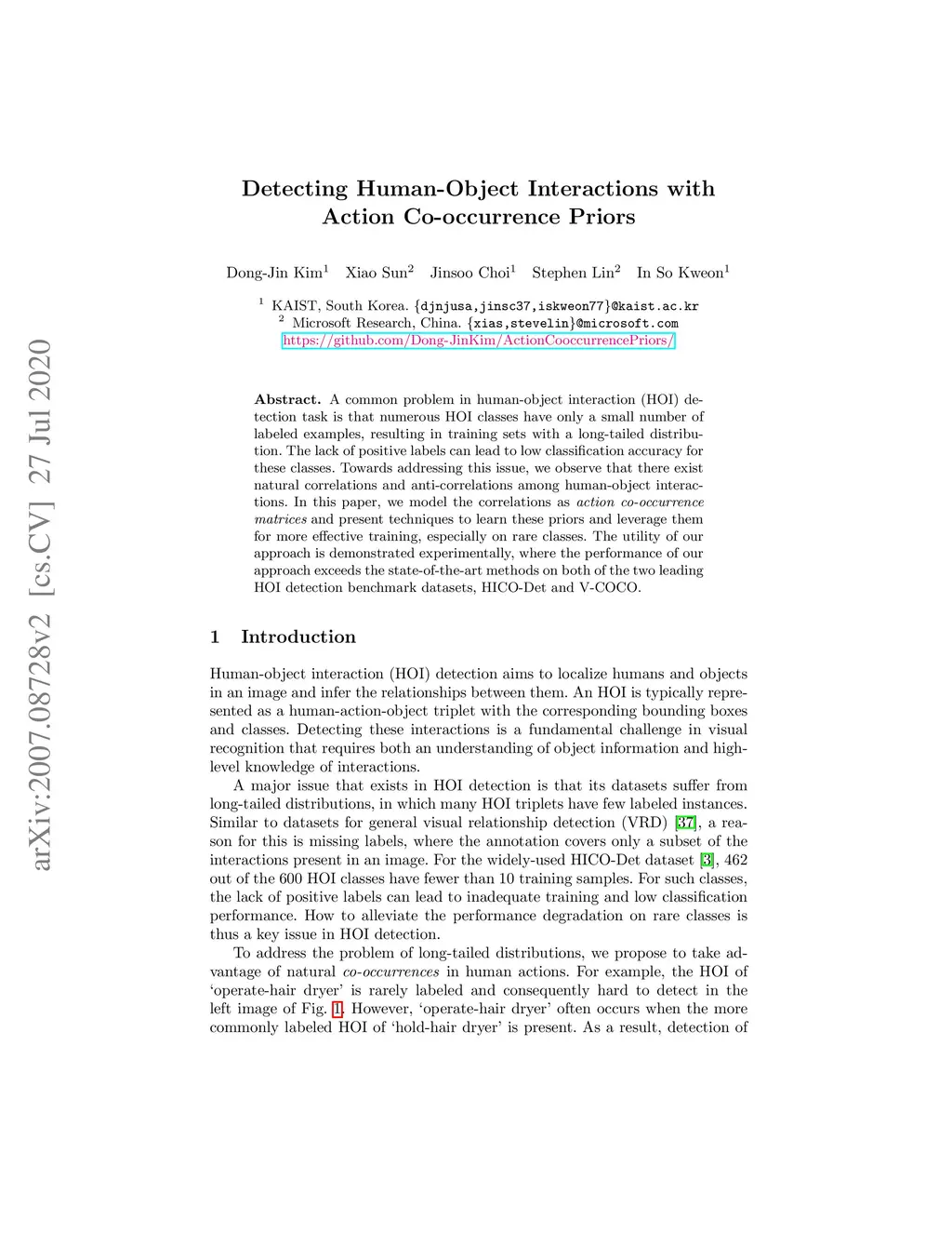 A common problem in human-object interaction (HOI) detection task is that numerous HOI classes have only a small number of labeled examples, resulting in training sets with a long-tailed distribution. The lack of positive labels can lead to low classification accuracy for these classes. Towards addressing this issue, we observe that there exist natural correlations and anti-correlations among human-object interactions. In this paper, we model the correlations as action co-occurrence matrices and present techniques to learn these priors and leverage them for more effective training, especially in rare classes. The utility of our approach is demonstrated experimentally, where the performance of our approach exceeds the state-of-the-art methods on both of the two leading HOI detection benchmark datasets, HICO-Det and V-COCO.