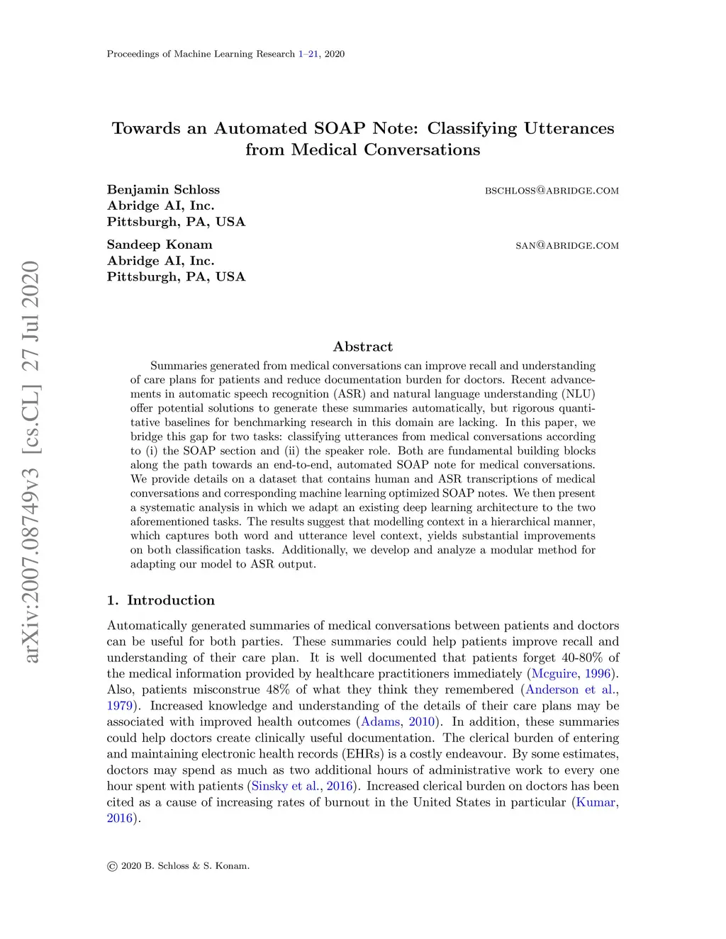 Summaries generated from medical conversations can improve recall and understanding of care plans for patients and reduce documentation burden for doctors. Recent advancements in automatic speech recognition (ASR) and natural language understanding (NLU) offer potential solutions to generate these summaries automatically, but rigorous quantitative baselines for benchmarking research in this domain are lacking. In this paper, we bridge this gap for two tasks: classifying utterances from medical conversations according to (i) the SOAP section and (ii) the speaker role. Both are fundamental building blocks along the path towards an end-to-end, automated SOAP note for medical conversations. We provide details on a dataset that contains human and ASR transcriptions of medical conversations and corresponding machine learning optimized SOAP notes. We then present a systematic analysis in which we adapt an existing deep learning architecture to the two aforementioned tasks. The results suggest that modelling context in a hierarchical manner, which captures both word and utterance level context, yields substantial improvements on both classification tasks. Additionally, we develop and analyze a modular method for adapting our model to ASR output.