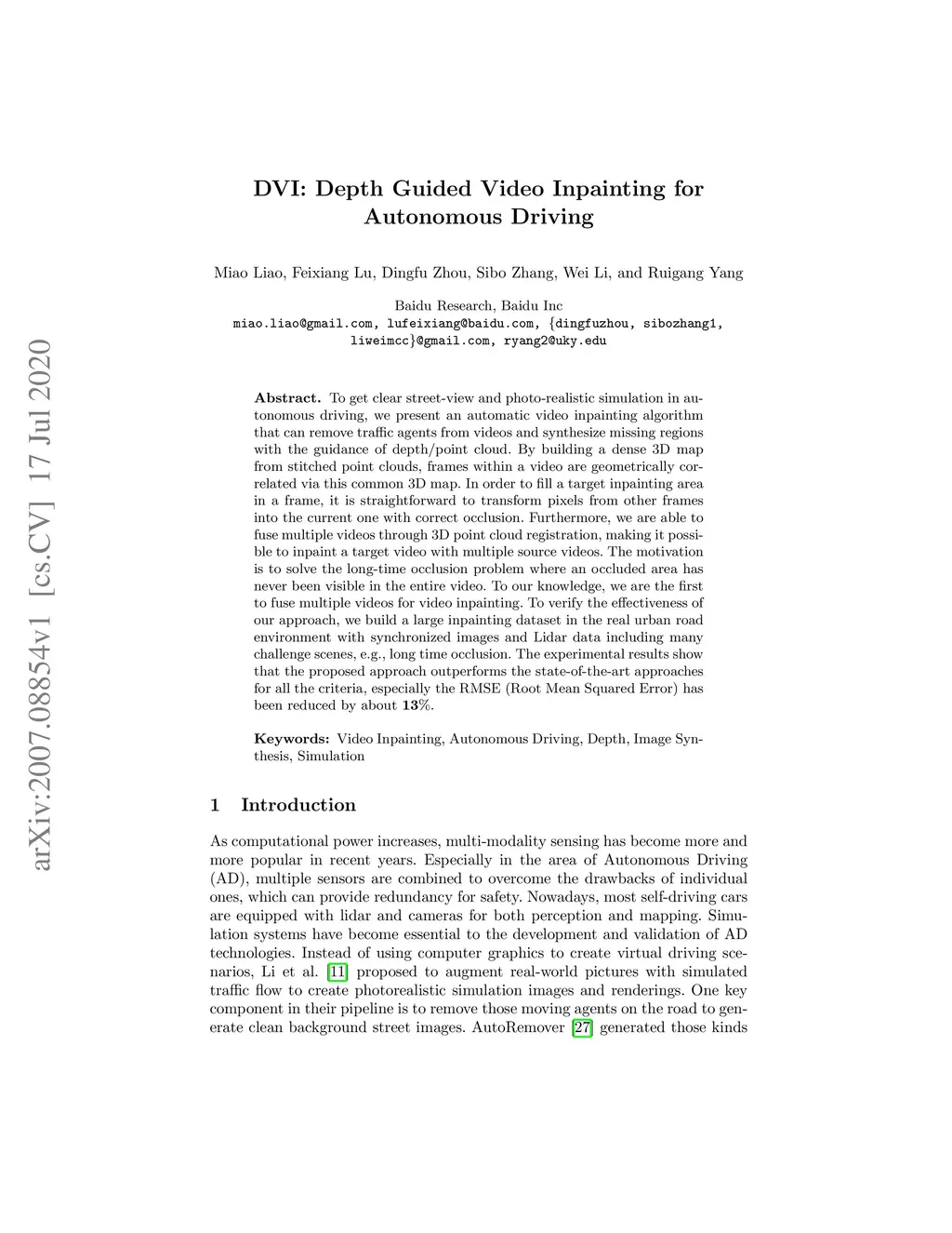 DVI: Depth Guided Video Inpainting for Autonomous Driving