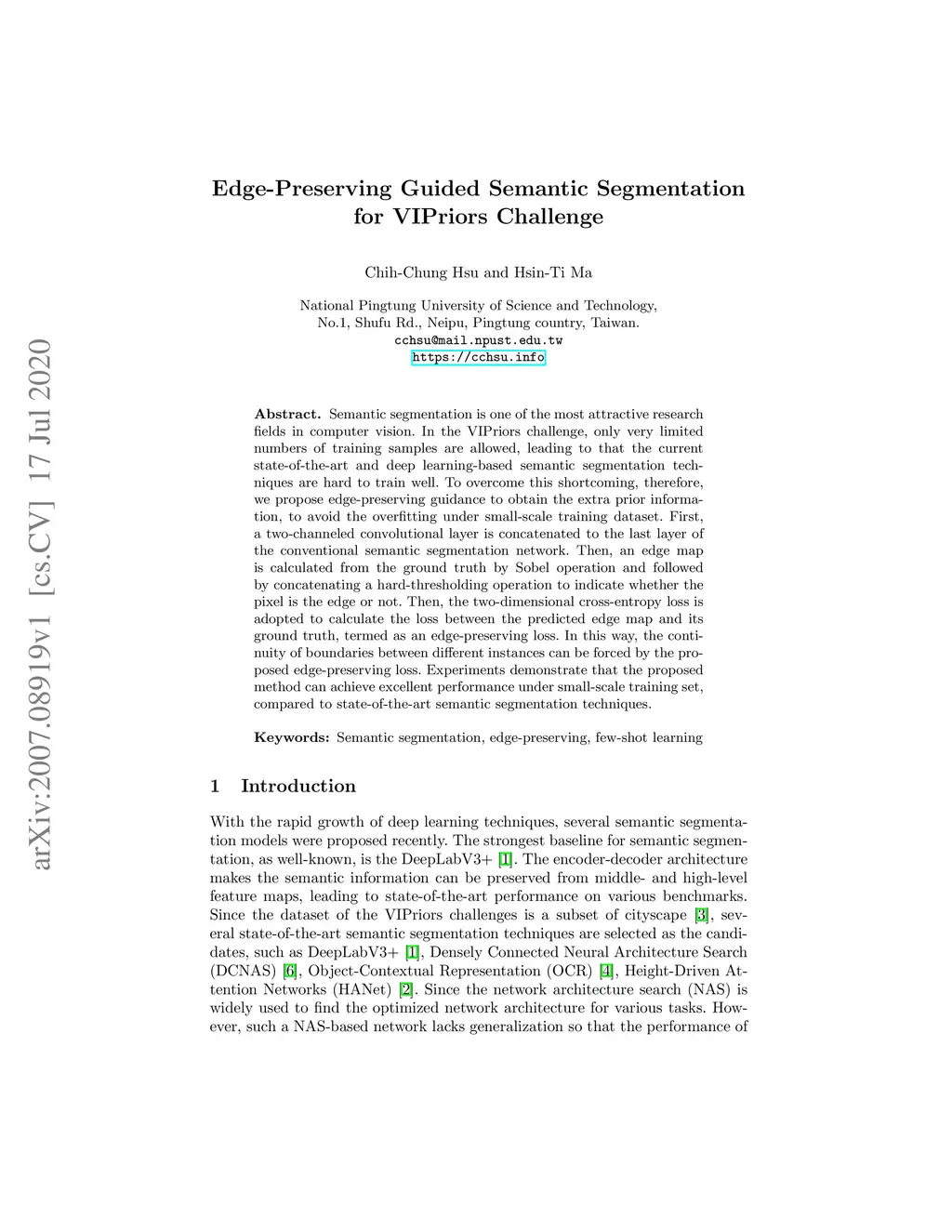 Semantic segmentation is one of the most attractive research fields in computer vision. In the VIPriors challenge, only very limited numbers of training samples are allowed, leading to that the current state-of-the-art and deep learning-based semantic segmentation techniques are hard to train well. To overcome this shortcoming, therefore, we propose edge-preserving guidance to obtain the extra prior information, to avoid the overfitting under small-scale training dataset. First, a two-channeled convolutional layer is concatenated to the last layer of the conventional semantic segmentation network. Then, an edge map is calculated from the ground truth by Sobel operation and followed by concatenating a hard-thresholding operation to indicate whether the pixel is the edge or not. Then, the two-dimensional cross-entropy loss is adopted to calculate the loss between the predicted edge map and its ground truth, termed as an edge-preserving loss. In this way, the continuity of boundaries between different instances can be forced by the proposed edge-preserving loss. Experiments demonstrate that the proposed method can achieve excellent performance under small-scale training set, compared to state-of-the-art semantic segmentation techniques.