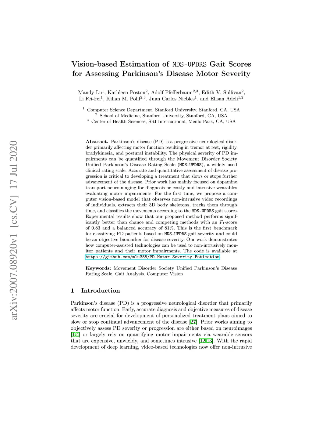 Parkinson's disease (PD) is a progressive neurological disorder primarily affecting motor function resulting in tremor at rest, rigidity, bradykinesia, and postural instability. The physical severity of PD impairments can be quantified through the Movement Disorder Society Unified Parkinson's Disease Rating Scale (MDS-UPDRS), a widely used clinical rating scale. Accurate and quantitative assessment of disease progression is critical to developing a treatment that slows or stops further advancement of the disease. Prior work has mainly focused on dopamine transport neuroimaging for diagnosis or costly and intrusive wearables evaluating motor impairments. For the first time, we propose a computer vision-based model that observes non-intrusive video recordings of individuals, extracts their 3D body skeletons, tracks them through time, and classifies the movements according to the MDS-UPDRS gait scores. Experimental results show that our proposed method performs significantly better than chance and competing methods with an F1-score of 0.83 and a balanced accuracy of 81%. This is the first benchmark for classifying PD patients based on MDS-UPDRS gait severity and could be an objective biomarker for disease severity. Our work demonstrates how computer-assisted technologies can be used to non-intrusively monitor patients and their motor impairments. The code is available at https://github.com/mlu355/PD-Motor-Severity-Estimation.
