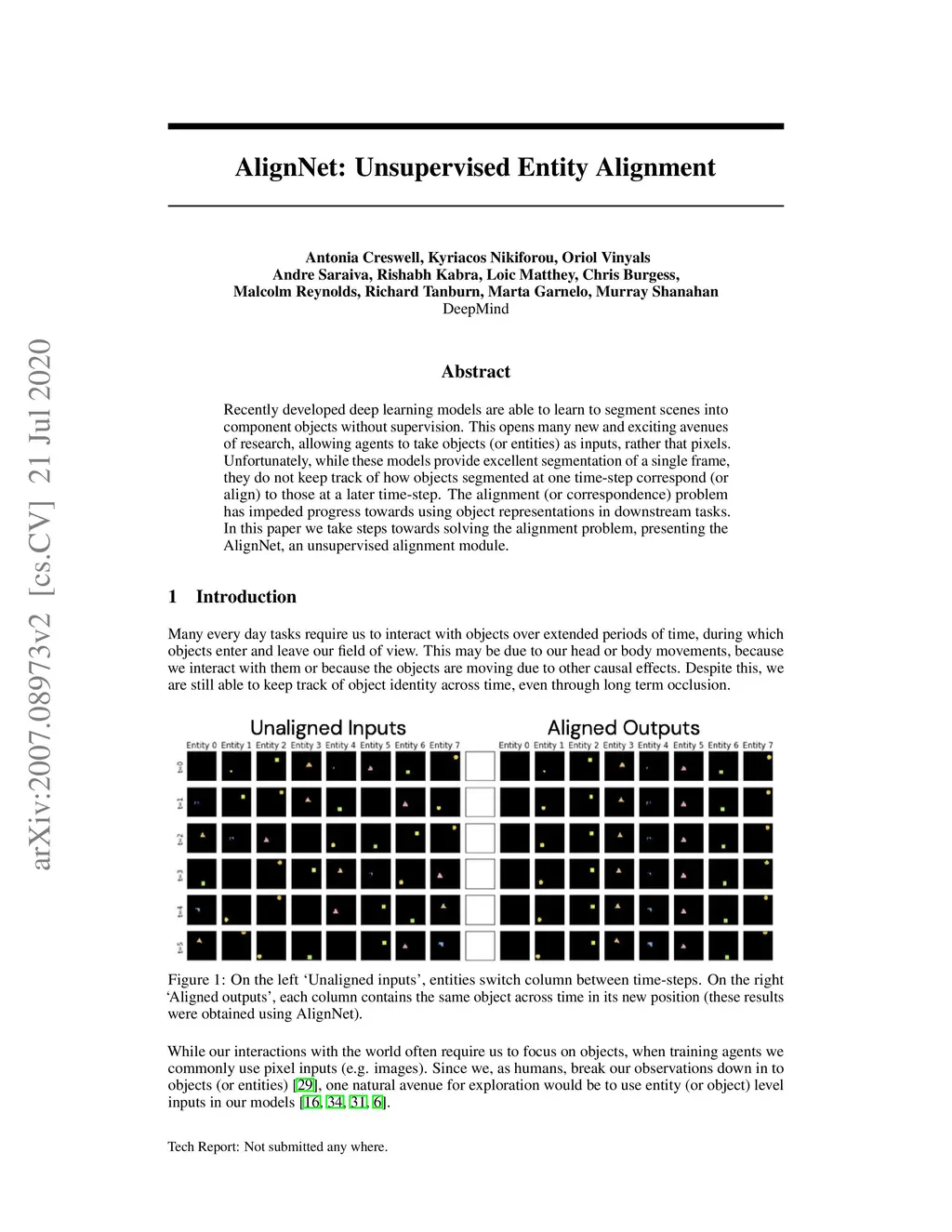 Recently developed deep learning models are able to learn to segment scenes into component objects without supervision. This opens many new and exciting avenues of research, allowing agents to take objects (or entities) as inputs, rather that pixels. Unfortunately, while these models provide excellent segmentation of a single frame, they do not keep track of how objects segmented at one time-step correspond (or align) to those at a later time-step. The alignment (or correspondence) problem has impeded progress towards using object representations in downstream tasks. In this paper we take steps towards solving the alignment problem, presenting the AlignNet, an unsupervised alignment module.