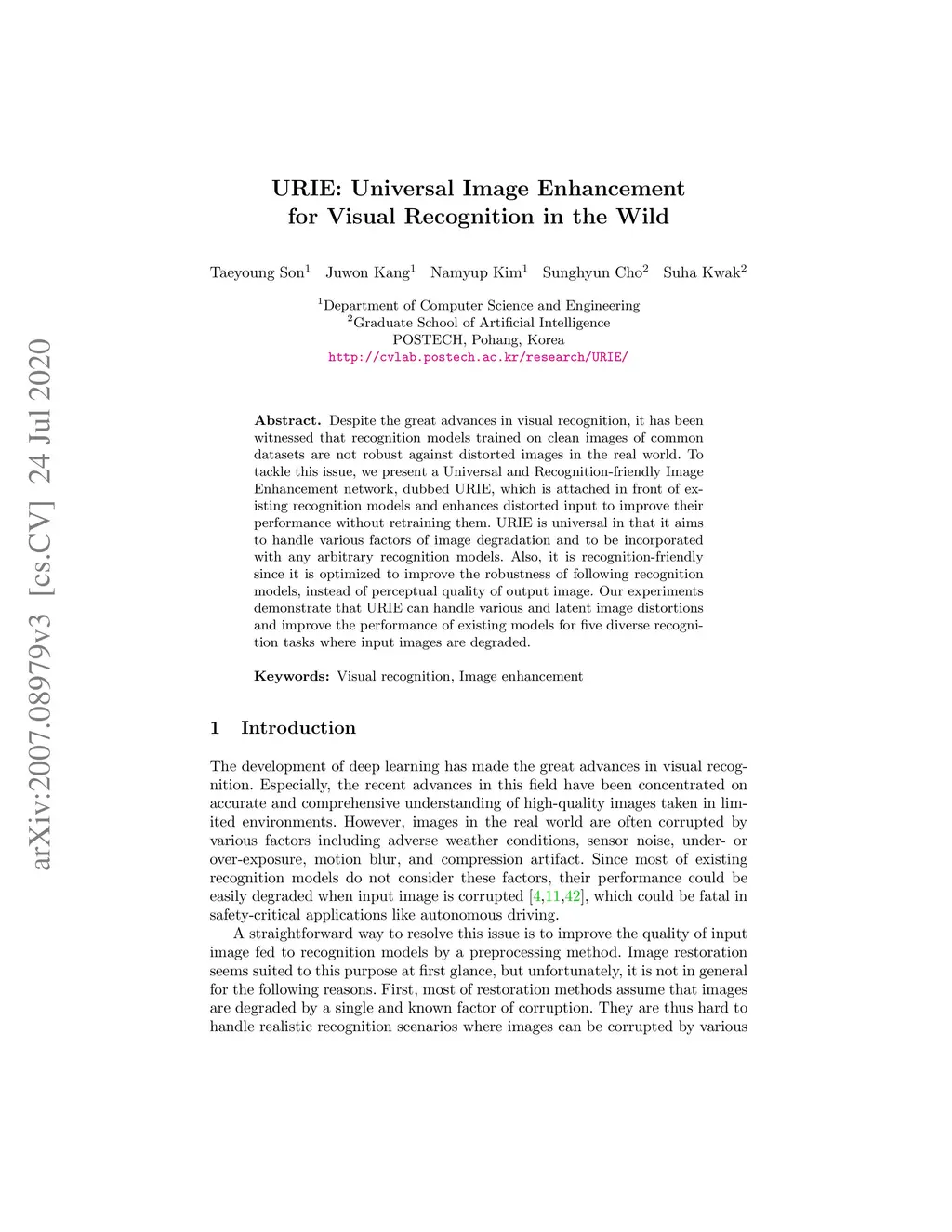 Despite the great advances in visual recognition, it has been witnessed that recognition models trained on clean images of common datasets are not robust against distorted images in the real world. To tackle this issue, we present a Universal and Recognition-friendly Image Enhancement network, dubbed URIE, which is attached in front of existing recognition models and enhances distorted input to improve their performance without retraining them. URIE is universal in that it aims to handle various factors of image degradation and to be incorporated with any arbitrary recognition models. Also, it is recognition-friendly since it is optimized to improve the robustness of following recognition models, instead of perceptual quality of output image. Our experiments demonstrate that URIE can handle various and latent image distortions and improve the performance of existing models for five diverse recognition tasks when input images are degraded.