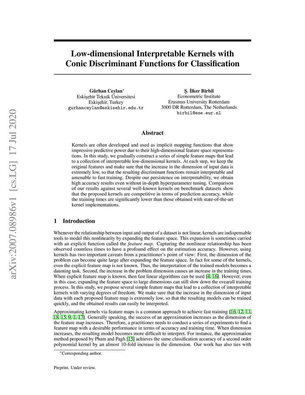 Low-dimensional Interpretable Kernels with Conic Discriminant Functions