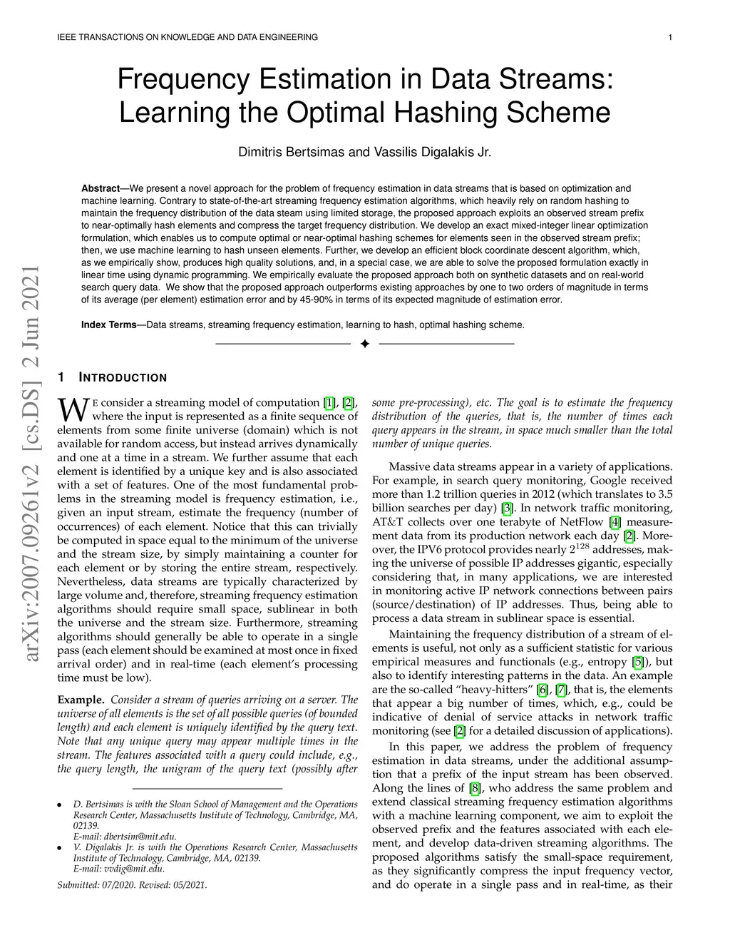 We present a novel approach for the problem of frequency estimation in data streams that is based on optimization and machine learning. Contrary to state-of-the-art streaming frequency estimation algorithms, which heavily rely on random hashing to maintain the frequency distribution of the data steam using limited storage, the proposed approach exploits an observed stream prefix to near-optimally hash elements and compress the target frequency distribution. We develop an exact mixed-integer linear optimization formulation, which enables us to compute optimal or near-optimal hashing schemes for elements seen in the observed stream prefix; then, we use machine learning to hash unseen elements. Further, we develop an efficient block coordinate descent algorithm, which, as we empirically show, produces high quality solutions, and, in a special case, we are able to solve the proposed formulation exactly in linear time using dynamic programming. We empirically evaluate the proposed approach both on synthetic datasets and on real-world search query data. We show that the proposed approach outperforms existing approaches by one to two orders of magnitude in terms of its average (per element) estimation error and by 45-90% in terms of its expected magnitude of estimation error.