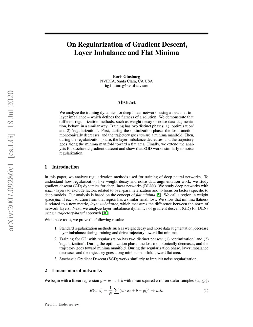 We analyze the training dynamics for deep linear networks using a new metric - layer imbalance - which defines the flatness of a solution. We demonstrate that different regularization methods, such as weight decay or noise data augmentation, behave in a similar way. Training has two distinct phases: 1) optimization and 2) regularization. First, during the optimization phase, the loss function monotonically decreases, and the trajectory goes toward a minima manifold. Then, during the regularization phase, the layer imbalance decreases, and the trajectory goes along the minima manifold toward a flat area. Finally, we extend the analysis for stochastic gradient descent and show that SGD works similarly to noise regularization.