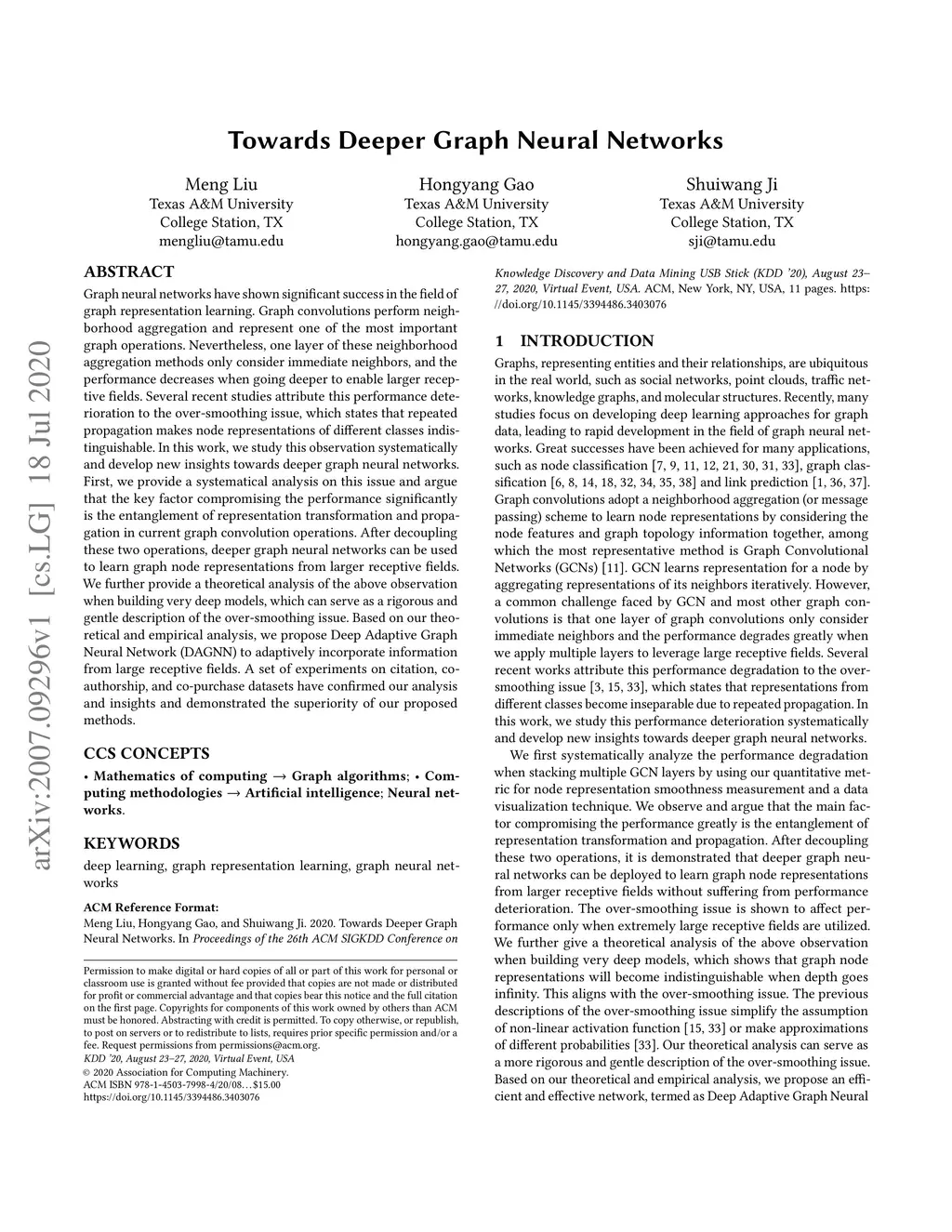 Graph neural networks have shown significant success in the field of graph representation learning. Graph convolutions perform neighborhood aggregation and represent one of the most important graph operations. Nevertheless, one layer of these neighborhood aggregation methods only consider immediate neighbors, and the performance decreases when going deeper to enable larger receptive fields. Several recent studies attribute this performance deterioration to the over-smoothing issue, which states that repeated propagation makes node representations of different classes indistinguishable. In this work, we study this observation systematically and develop new insights towards deeper graph neural networks. First, we provide a systematical analysis on this issue and argue that the key factor compromising the performance significantly is the entanglement of representation transformation and propagation in current graph convolution operations. After decoupling these two operations, deeper graph neural networks can be used to learn graph node representations from larger receptive fields. We further provide a theoretical analysis of the above observation when building very deep models, which can serve as a rigorous and gentle description of the over-smoothing issue. Based on our theoretical and empirical analysis, we propose Deep Adaptive Graph Neural Network (DAGNN) to adaptively incorporate information from large receptive fields. A set of experiments on citation, co-authorship, and co-purchase datasets have confirmed our analysis and insights and demonstrated the superiority of our proposed methods.