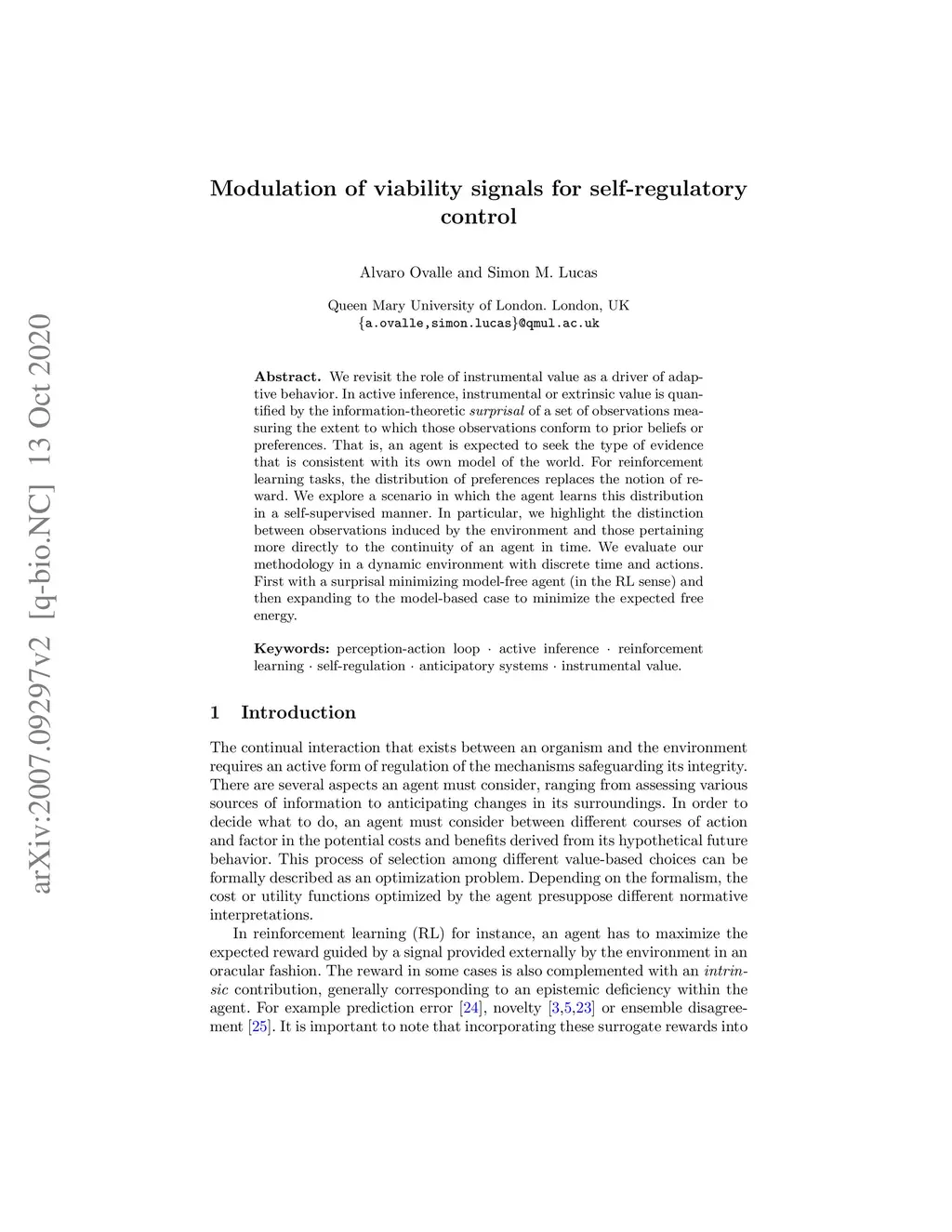 We revisit the role of instrumental value as a driver of adaptive behavior. In active inference, instrumental or extrinsic value is quantified by the information-theoretic surprisal of a set of observations measuring the extent to which those observations conform to prior beliefs or preferences. That is, an agent is expected to seek the type of evidence that is consistent with its own model of the world. For reinforcement learning tasks, the distribution of preferences replaces the notion of reward. We explore a scenario in which the agent learns this distribution in a self-supervised manner. In particular, we highlight the distinction between observations induced by the environment and those pertaining more directly to the continuity of an agent in time. We evaluate our methodology in a dynamic environment with discrete time and actions. First with a surprisal minimizing model-free agent (in the RL sense) and then expanding to the model-based case to minimize the expected free energy.