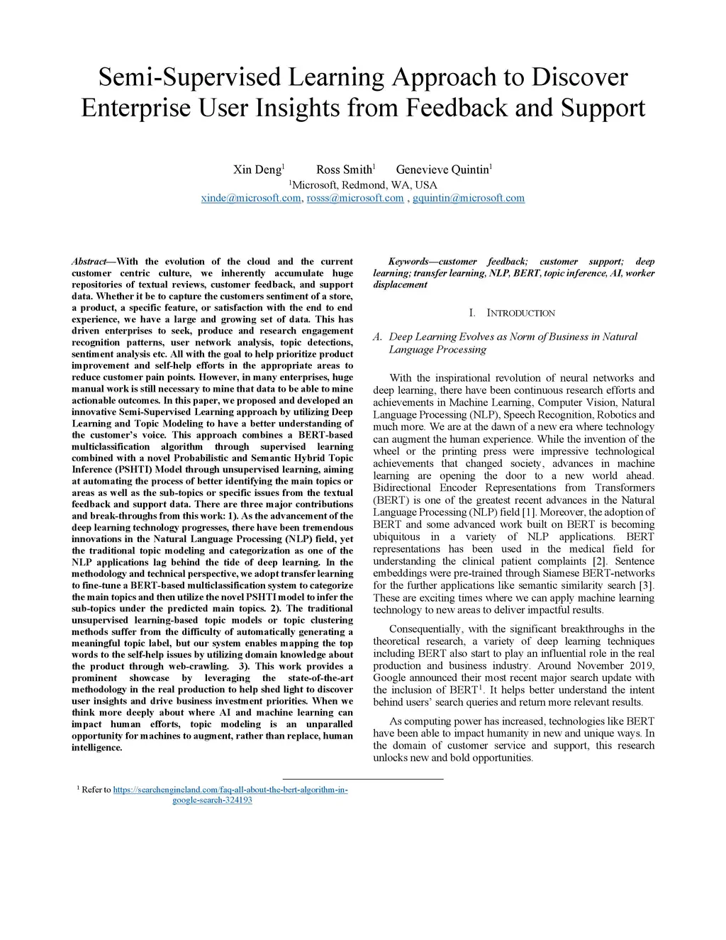 With the evolution of the cloud and customer centric culture, we inherently accumulate huge repositories of textual reviews, feedback, and support data.This has driven enterprises to seek and research engagement patterns, user network analysis, topic detections, etc.However, huge manual work is still necessary to mine data to be able to mine actionable outcomes. In this paper, we proposed and developed an innovative Semi-Supervised Learning approach by utilizing Deep Learning and Topic Modeling to have a better understanding of the user voice.This approach combines a BERT-based multiclassification algorithm through supervised learning combined with a novel Probabilistic and Semantic Hybrid Topic Inference (PSHTI) Model through unsupervised learning, aiming at automating the process of better identifying the main topics or areas as well as the sub-topics from the textual feedback and support.There are three major break-through: 1. As the advancement of deep learning technology, there have been tremendous innovations in the NLP field, yet the traditional topic modeling as one of the NLP applications lag behind the tide of deep learning. In the methodology and technical perspective, we adopt transfer learning to fine-tune a BERT-based multiclassification system to categorize the main topics and then utilize the novel PSHTI model to infer the sub-topics under the predicted main topics. 2. The traditional unsupervised learning-based topic models or clustering methods suffer from the difficulty of automatically generating a meaningful topic label, but our system enables mapping the top words to the self-help issues by utilizing domain knowledge about the product through web-crawling. 3. This work provides a prominent showcase by leveraging the state-of-the-art methodology in the real production to help shed light to discover user insights and drive business investment priorities.