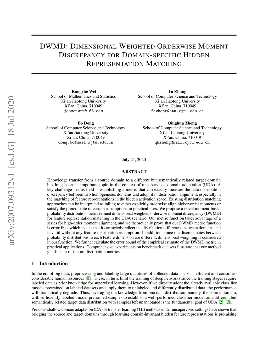Knowledge transfer from a source domain to a different but semantically related target domain has long been an important topic in the context of unsupervised domain adaptation (UDA). A key challenge in this field is establishing a metric that can exactly measure the data distribution discrepancy between two homogeneous domains and adopt it in distribution alignment, especially in the matching of feature representations in the hidden activation space. Existing distribution matching approaches can be interpreted as failing to either explicitly orderwise align higher-order moments or satisfy the prerequisite of certain assumptions in practical uses. We propose a novel moment-based probability distribution metric termed dimensional weighted orderwise moment discrepancy (DWMD) for feature representation matching in the UDA scenario. Our metric function takes advantage of a series for high-order moment alignment, and we theoretically prove that our DWMD metric function is error-free, which means that it can strictly reflect the distribution differences between domains and is valid without any feature distribution assumption. In addition, since the discrepancies between probability distributions in each feature dimension are different, dimensional weighting is considered in our function. We further calculate the error bound of the empirical estimate of the DWMD metric in practical applications. Comprehensive experiments on benchmark datasets illustrate that our method yields state-of-the-art distribution metrics.