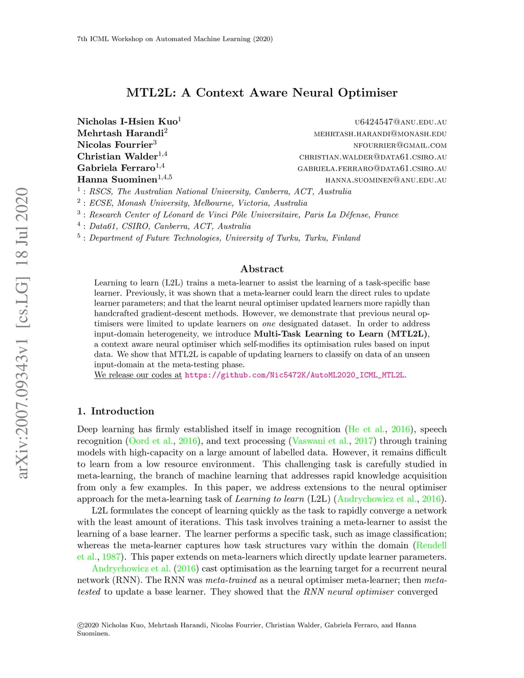 MTL2L: A Context Aware Neural Optimiser