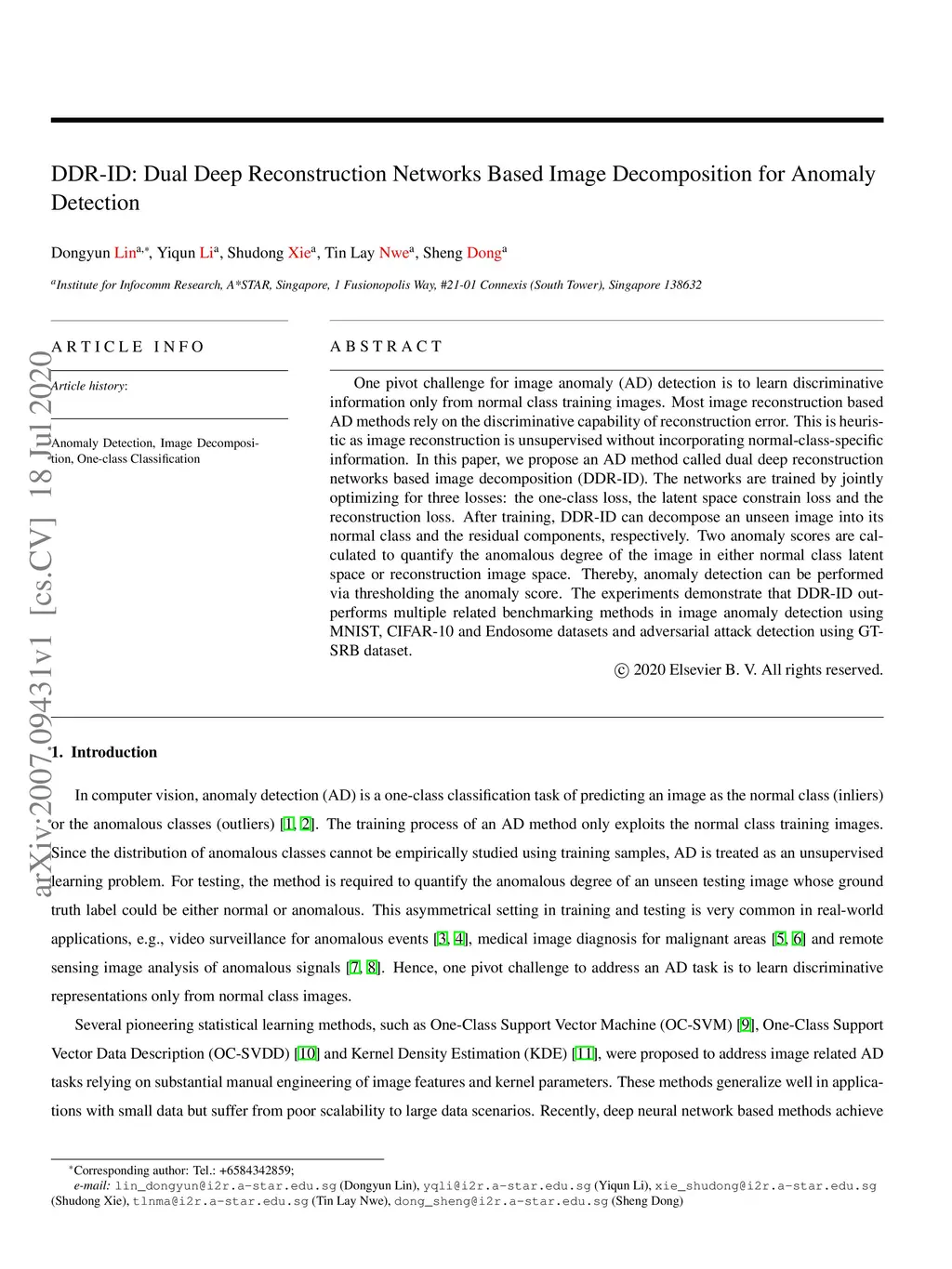 One pivot challenge for image anomaly (AD) detection is to learn discriminative information only from normal class training images. Most image reconstruction based AD methods rely on the discriminative capability of reconstruction error. This is heuristic as image reconstruction is unsupervised without incorporating normal-class-specific information. In this paper, we propose an AD method called dual deep reconstruction networks based image decomposition (DDR-ID). The networks are trained by jointly optimizing for three losses: the one-class loss, the latent space constrain loss and the reconstruction loss. After training, DDR-ID can decompose an unseen image into its normal class and the residual components, respectively. Two anomaly scores are calculated to quantify the anomalous degree of the image in either normal class latent space or reconstruction image space. Thereby, anomaly detection can be performed via thresholding the anomaly score. The experiments demonstrate that DDR-ID outperforms multiple related benchmarking methods in image anomaly detection using MNIST, CIFAR-10 and Endosome datasets and adversarial attack detection using GTSRB dataset.