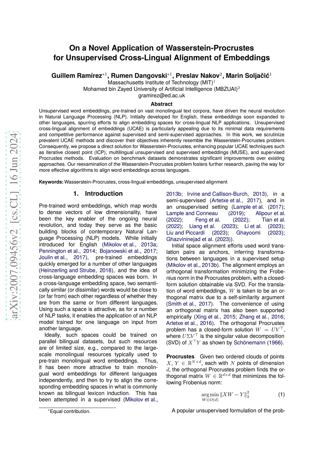 On a Novel Application of Wasserstein-Procrustes for Unsupervised