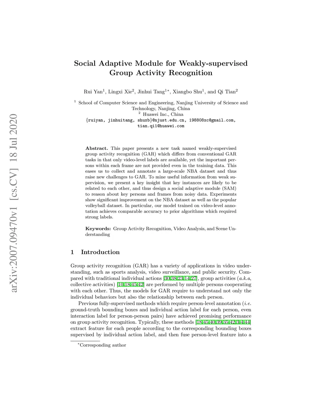 This paper presents a new task named weakly-supervised group activity recognition (GAR) which differs from conventional GAR tasks in that only video-level labels are available, yet the important persons within each frame are not provided even in the training data. This eases us to collect and annotate a large-scale NBA dataset and thus raise new challenges to GAR. To mine useful information from weak supervision, we present a key insight that key instances are likely to be related to each other, and thus design a social adaptive module (SAM) to reason about key persons and frames from noisy data. Experiments show significant improvement on the NBA dataset as well as the popular volleyball dataset. In particular, our model trained on video-level annotation achieves comparable accuracy to prior algorithms which required strong labels.