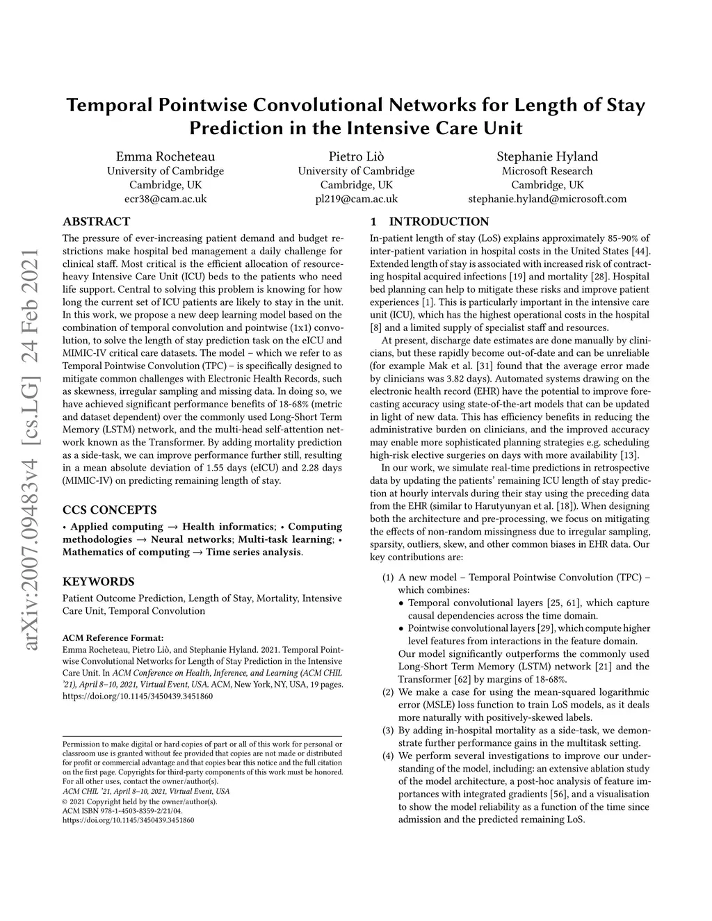 The pressure of ever-increasing patient demand and budget restrictions make hospital bed management a daily challenge for clinical staff. Most critical is the efficient allocation of resource-heavy Intensive Care Unit (ICU) beds to the patients who need life support. Central to solving this problem is knowing for how long the current set of ICU patients are likely to stay in the unit. In this work, we propose a new deep learning model based on the combination of temporal convolution and pointwise (1x1) convolution, to solve the length of stay prediction task on the eICU and MIMIC-IV critical care datasets. The model - which we refer to as Temporal Pointwise Convolution (TPC) - is specifically designed to mitigate common challenges with Electronic Health Records, such as skewness, irregular sampling and missing data. In doing so, we have achieved significant performance benefits of 18-68% (metric and dataset dependent) over the commonly used Long-Short Term Memory (LSTM) network, and the multi-head self-attention network known as the Transformer. By adding mortality prediction as a side-task, we can improve performance further still, resulting in a mean absolute deviation of 1.55 days (eICU) and 2.28 days (MIMIC-IV) on predicting remaining length of stay.