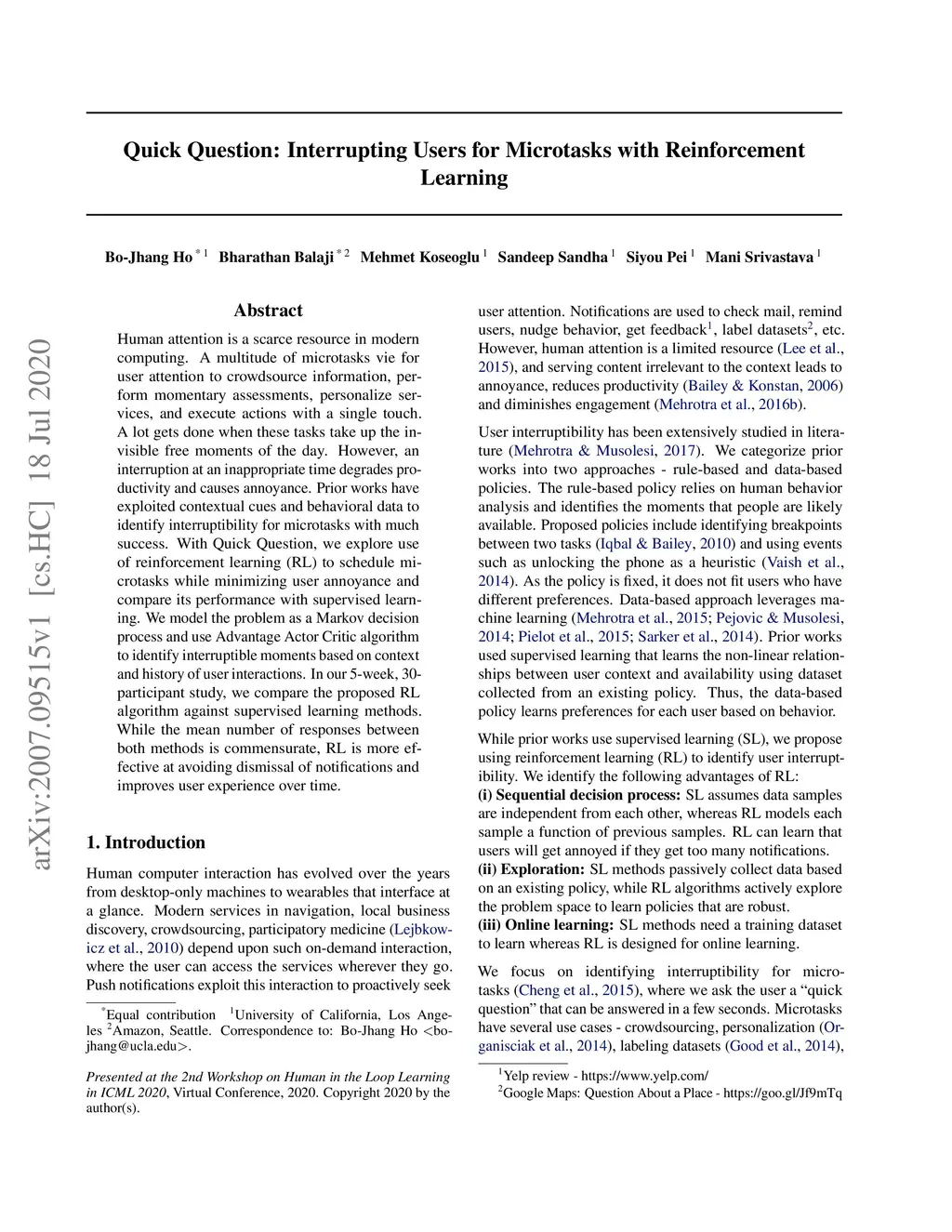 Human attention is a scarce resource in modern computing. A multitude of microtasks vie for user attention to crowdsource information, perform momentary assessments, personalize services, and execute actions with a single touch. A lot gets done when these tasks take up the invisible free moments of the day. However, an interruption at an inappropriate time degrades productivity and causes annoyance. Prior works have exploited contextual cues and behavioral data to identify interruptibility for microtasks with much success. With Quick Question, we explore use of reinforcement learning (RL) to schedule microtasks while minimizing user annoyance and compare its performance with supervised learning. We model the problem as a Markov decision process and use Advantage Actor Critic algorithm to identify interruptible moments based on context and history of user interactions. In our 5-week, 30-participant study, we compare the proposed RL algorithm against supervised learning methods. While the mean number of responses between both methods is commensurate, RL is more effective at avoiding dismissal of notifications and improves user experience over time.