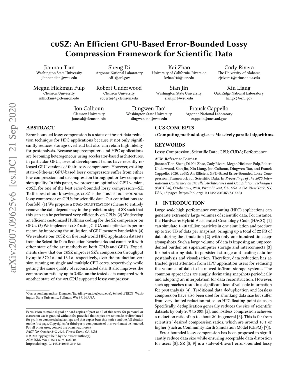 Error-bounded lossy compression is a state-of-the-art data reduction technique for HPC applications because it not only significantly reduces storage overhead but also can retain high fidelity for postanalysis. Because supercomputers and HPC applications are becoming heterogeneous using accelerator-based architectures, in particular GPUs, several development teams have recently released GPU versions of their lossy compressors. However, existing state-of-the-art GPU-based lossy compressors suffer from either low compression and decompression throughput or low compression quality. In this paper, we present an optimized GPU version, cuSZ, for one of the best error-bounded lossy compressors-SZ. To the best of our knowledge, cuSZ is the first error-bounded lossy compressor on GPUs for scientific data. Our contributions are fourfold. (1) We propose a dual-quantization scheme to entirely remove the data dependency in the prediction step of SZ such that this step can be performed very efficiently on GPUs. (2) We develop an efficient customized Huffman coding for the SZ compressor on GPUs. (3) We implement cuSZ using CUDA and optimize its performance by improving the utilization of GPU memory bandwidth. (4) We evaluate our cuSZ on five real-world HPC application datasets from the Scientific Data Reduction Benchmarks and compare it with other state-of-the-art methods on both CPUs and GPUs. Experiments show that our cuSZ improves SZ's compression throughput by up to 370.1x and 13.1x, respectively, over the production version running on single and multiple CPU cores, respectively, while getting the same quality of reconstructed data. It also improves the compression ratio by up to 3.48x on the tested data compared with another state-of-the-art GPU supported lossy compressor.