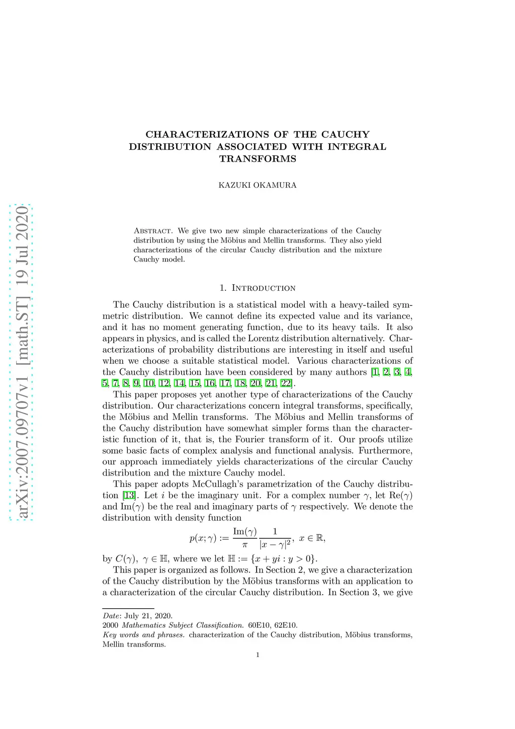 We give two new simple characterizations of the Cauchy distribution by using the M\"obius and Mellin transforms. They also yield characterizations of the circular Cauchy distribution and the mixture Cauchy model.