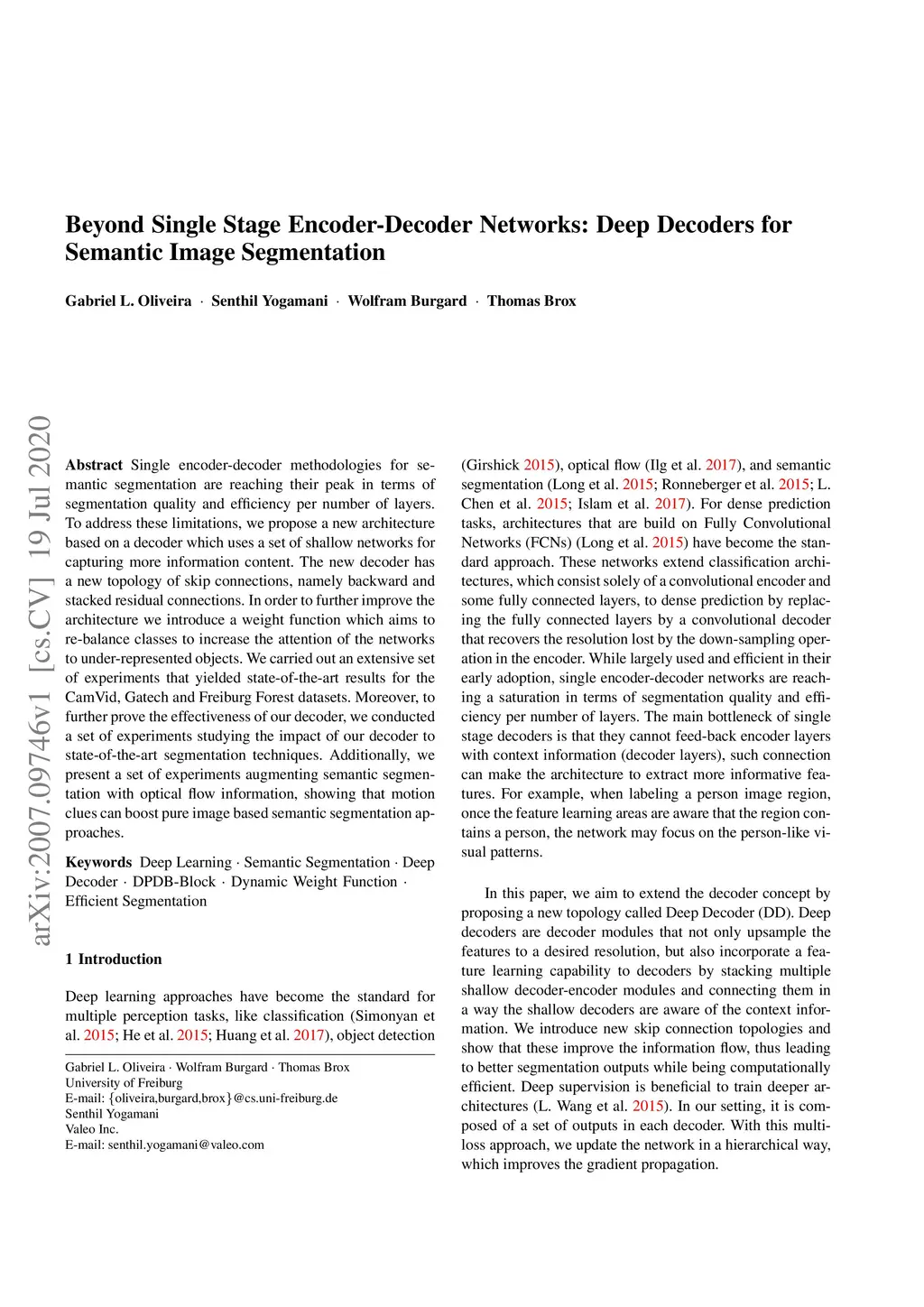 Single encoder-decoder methodologies for semantic segmentation are reaching their peak in terms of segmentation quality and efficiency per number of layers. To address these limitations, we propose a new architecture based on a decoder which uses a set of shallow networks for capturing more information content. The new decoder has a new topology of skip connections, namely backward and stacked residual connections. In order to further improve the architecture we introduce a weight function which aims to re-balance classes to increase the attention of the networks to under-represented objects. We carried out an extensive set of experiments that yielded state-of-the-art results for the CamVid, Gatech and Freiburg Forest datasets. Moreover, to further prove the effectiveness of our decoder, we conducted a set of experiments studying the impact of our decoder to state-of-the-art segmentation techniques. Additionally, we present a set of experiments augmenting semantic segmentation with optical flow information, showing that motion clues can boost pure image based semantic segmentation approaches.