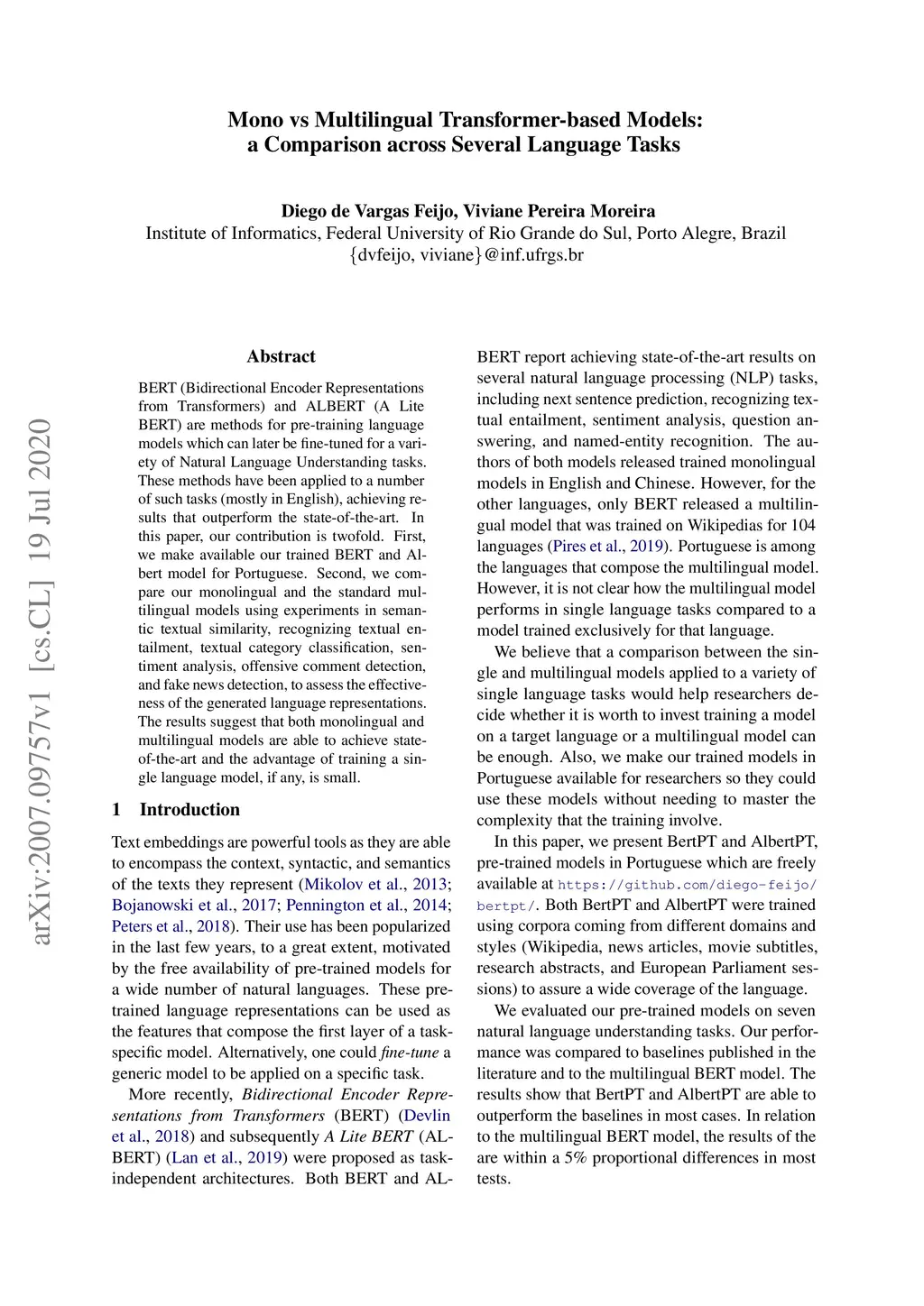 BERT (Bidirectional Encoder Representations from Transformers) and ALBERT (A Lite BERT) are methods for pre-training language models which can later be fine-tuned for a variety of Natural Language Understanding tasks. These methods have been applied to a number of such tasks (mostly in English), achieving results that outperform the state-of-the-art. In this paper, our contribution is twofold. First, we make available our trained BERT and Albert model for Portuguese. Second, we compare our monolingual and the standard multilingual models using experiments in semantic textual similarity, recognizing textual entailment, textual category classification, sentiment analysis, offensive comment detection, and fake news detection, to assess the effectiveness of the generated language representations. The results suggest that both monolingual and multilingual models are able to achieve state-of-the-art and the advantage of training a single language model, if any, is small.
