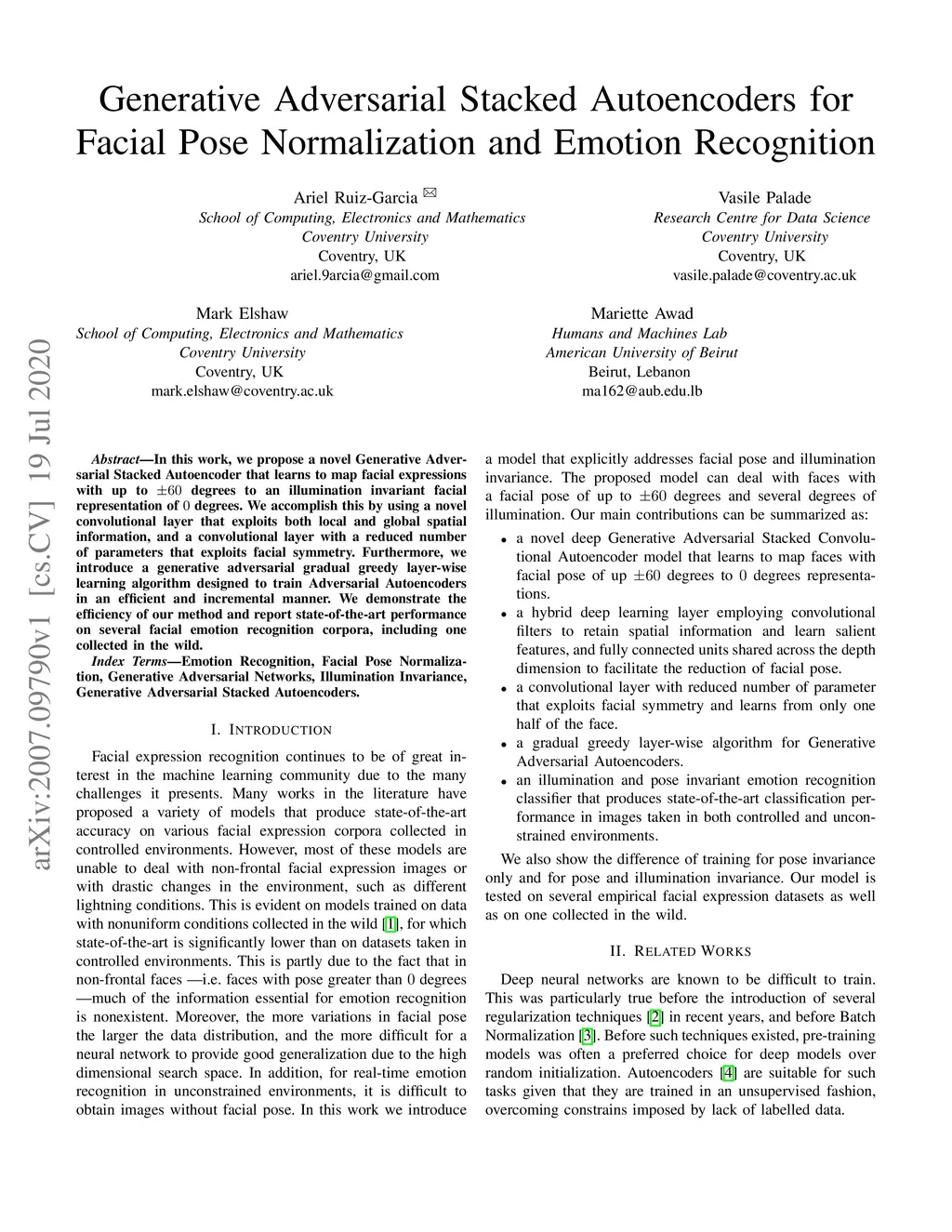 In this work, we propose a novel Generative Adversarial Stacked Autoencoder that learns to map facial expressions, with up to plus or minus 60 degrees, to an illumination invariant facial representation of 0 degrees. We accomplish this by using a novel convolutional layer that exploits both local and global spatial information, and a convolutional layer with a reduced number of parameters that exploits facial symmetry. Furthermore, we introduce a generative adversarial gradual greedy layer-wise learning algorithm designed to train Adversarial Autoencoders in an efficient and incremental manner. We demonstrate the efficiency of our method and report state-of-the-art performance on several facial emotion recognition corpora, including one collected in the wild.