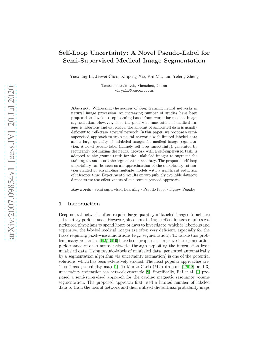 Witnessing the success of deep learning neural networks in natural image processing, an increasing number of studies have been proposed to develop deep-learning-based frameworks for medical image segmentation. However, since the pixel-wise annotation of medical images is laborious and expensive, the amount of annotated data is usually deficient to well-train a neural network. In this paper, we propose a semi-supervised approach to train neural networks with limited labeled data and a large quantity of unlabeled images for medical image segmentation. A novel pseudo-label (namely self-loop uncertainty), generated by recurrently optimizing the neural network with a self-supervised task, is adopted as the ground-truth for the unlabeled images to augment the training set and boost the segmentation accuracy. The proposed self-loop uncertainty can be seen as an approximation of the uncertainty estimation yielded by ensembling multiple models with a significant reduction of inference time. Experimental results on two publicly available datasets demonstrate the effectiveness of our semi-supervied approach.