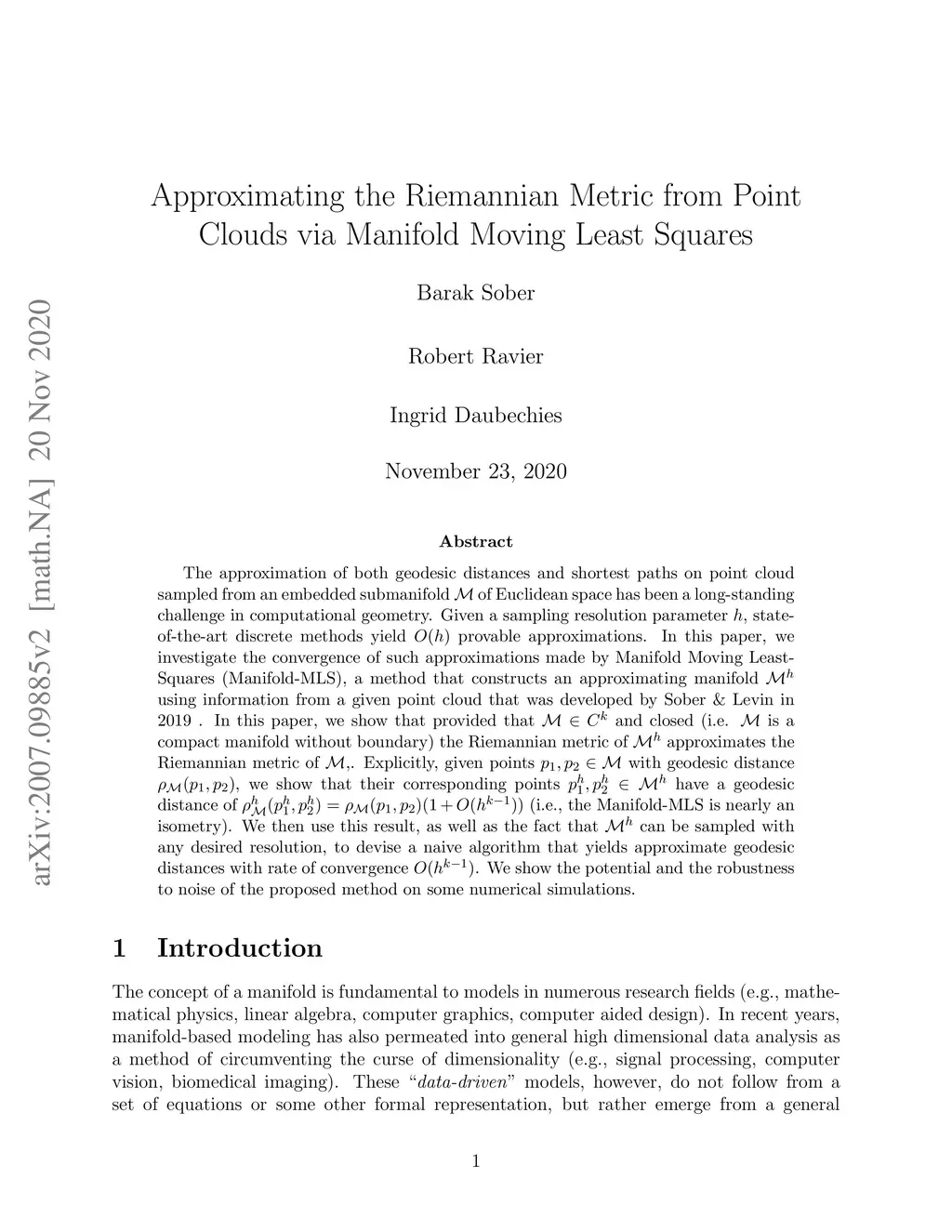The approximation of both geodesic distances and shortest paths on point cloud sampled from an embedded submanifold of Euclidean space has been a long-standing challenge in computational geometry. Given a sampling resolution parameter $ h $, state-of-the-art discrete methods yield $ O(h) $ provable approximations. In this paper, we investigate the convergence of such approximations made by Manifold Moving Least-Squares (Manifold-MLS), a method that constructs an approximating manifold using information from a given point cloud that was developed by Sober \& Levin in 2019. In this paper, we show that provided that and closed (i.e. is a compact manifold without boundary) the Riemannian metric of $ \mathcal{M}^h $ approximates the Riemannian metric of $ \mathcal{M}, $. Explicitly, given points $ p_1, p_2 \in \mathcal{M}$ with geodesic distance $ \rho_{\mathcal{M}}(p_1, p_2) $, we show that their corresponding points $ p_1^h, p_2^h \in \mathcal{M}^h$ have a geodesic distance of $ \rho_{\mathcal{M}^h}(p_1^h,p_2^h) = \rho_{\mathcal{M}}(p_1, p_2)(1 + O(h^{k-1})) $ (i.e., the Manifold-MLS is nearly an isometry). We then use this result, as well as the fact that $ \mathcal{M}^h $ can be sampled with any desired resolution, to devise a naive algorithm that yields approximate geodesic distances with a rate of convergence $ O(h^{k-1}) $. We show the potential and the robustness to noise of the proposed method on some numerical simulations.