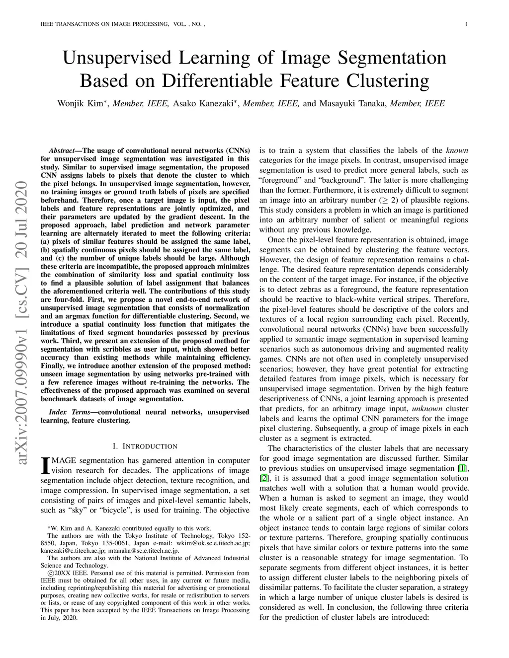 The usage of convolutional neural networks (CNNs) for unsupervised image segmentation was investigated in this study. In the proposed approach, label prediction and network parameter learning are alternately iterated to meet the following criteria: (a) pixels of similar features should be assigned the same label, (b) spatially continuous pixels should be assigned the same label, and (c) the number of unique labels should be large. Although these criteria are incompatible, the proposed approach minimizes the combination of similarity loss and spatial continuity loss to find a plausible solution of label assignment that balances the aforementioned criteria well. The contributions of this study are four-fold. First, we propose a novel end-to-end network of unsupervised image segmentation that consists of normalization and an argmax function for differentiable clustering. Second, we introduce a spatial continuity loss function that mitigates the limitations of fixed segment boundaries possessed by previous work. Third, we present an extension of the proposed method for segmentation with scribbles as user input, which showed better accuracy than existing methods while maintaining efficiency. Finally, we introduce another extension of the proposed method: unseen image segmentation by using networks pre-trained with a few reference images without re-training the networks. The effectiveness of the proposed approach was examined on several benchmark datasets of image segmentation.