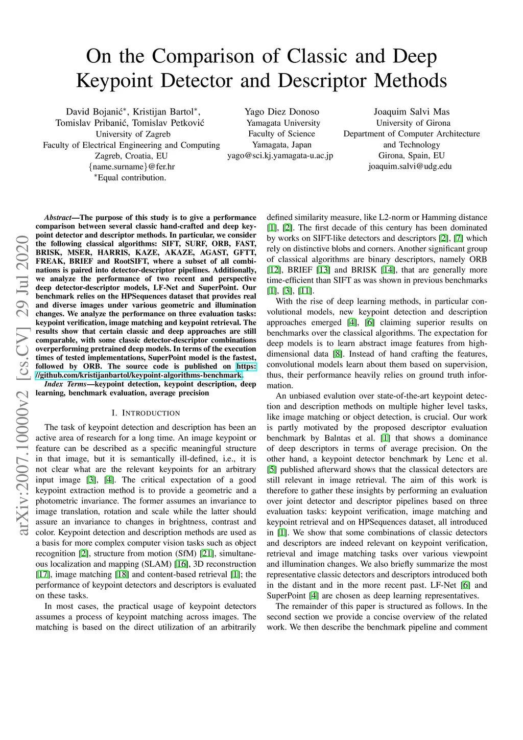 The purpose of this study is to give a performance comparison between several classic hand-crafted and deep key-point detector and descriptor methods. In particular, we consider the following classical algorithms: SIFT, SURF, ORB, FAST, BRISK, MSER, HARRIS, KAZE, AKAZE, AGAST, GFTT, FREAK, BRIEF and RootSIFT, where a subset of all combinations is paired into detector-descriptor pipelines. Additionally, we analyze the performance of two recent and perspective deep detector-descriptor models, LF-Net and SuperPoint. Our benchmark relies on the HPSequences dataset that provides real and diverse images under various geometric and illumination changes. We analyze the performance on three evaluation tasks: keypoint verification, image matching and keypoint retrieval. The results show that certain classic and deep approaches are still comparable, with some classic detector-descriptor combinations overperforming pretrained deep models. In terms of the execution times of tested implementations, SuperPoint model is the fastest, followed by ORB. The source code is published on \url{https://github.com/kristijanbartol/keypoint-algorithms-benchmark}.