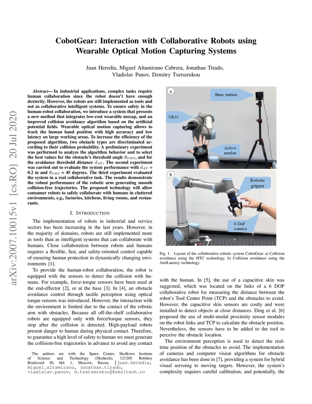 In industrial applications, complex tasks require human collaboration since the robot doesn't have enough dexterity. However, the robots are still implemented as tools and not as collaborative intelligent systems. To ensure safety in the human-robot collaboration, we introduce a system that presents a new method that integrates low-cost wearable mocap, and an improved collision avoidance algorithm based on the artificial potential fields. Wearable optical motion capturing allows to track the human hand position with high accuracy and low latency on large working areas. To increase the efficiency of the proposed algorithm, two obstacle types are discriminated according to their collision probability. A preliminary experiment was performed to analyze the algorithm behavior and to select the best values for the obstacle's threshold angle , and for the avoidance threshold distance . The second experiment was carried out to evaluate the system performance with = 0.2 m and = 45 degrees. The third experiment evaluated the system in a real collaborative task. The results demonstrate the robust performance of the robotic arm generating smooth collision-free trajectories. The proposed technology will allow consumer robots to safely collaborate with humans in cluttered environments, e.g., factories, kitchens, living rooms, and restaurants.