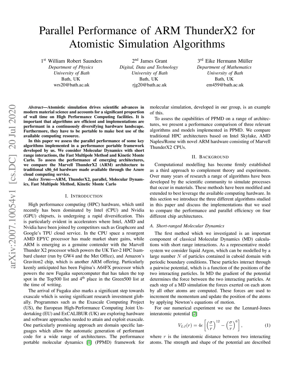 Atomistic simulation drives scientific advances in modern material science and accounts for a significant proportion of wall time on High Performance Computing facilities. It is important that algorithms are efficient and implementations are performant in a continuously diversifying hardware landscape. Furthermore, they have to be portable to make best use of the available computing resource. In this paper we assess the parallel performance of some key algorithms implemented in a performance portable framework developed by us. We consider Molecular Dynamics with short range interactions, the Fast Multipole Method and Kinetic Monte Carlo. To assess the performance of emerging architectures, we compare the Marvell ThunderX2 (ARM) architecture to traditional x86_64 hardware made available through the Azure cloud computing service.
