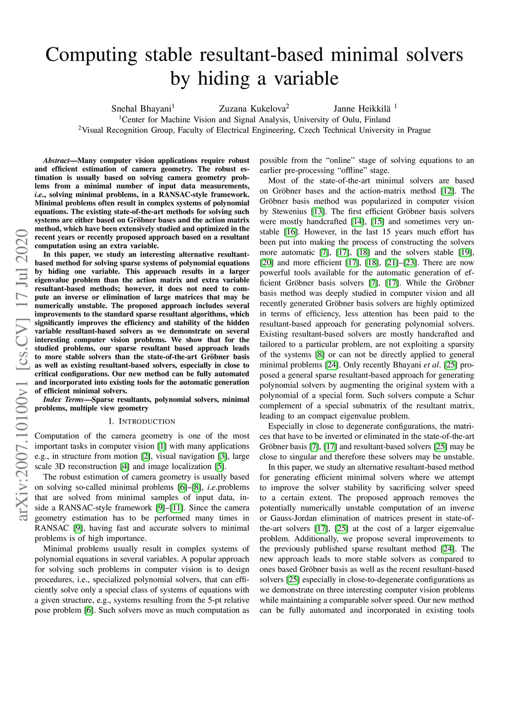 Many computer vision applications require robust and efficient estimation of camera geometry. The robust estimation is usually based on solving camera geometry problems from a minimal number of input data measurements, i.e., solving minimal problems, in a RANSAC-style framework. Minimal problems often result in complex systems of polynomial equations. The existing state-of-the-art methods for solving such systems are either based on Gr\"obner bases and the action matrix method, which have been extensively studied and optimized in the recent years or recently proposed approach based on a sparse resultant computation using an extra variable. In this paper, we study an interesting alternative sparse resultant-based method for solving sparse systems of polynomial equations by hiding one variable. This approach results in a larger eigenvalue problem than the action matrix and extra variable sparse resultant-based methods; however, it does not need to compute an inverse or elimination of large matrices that may be numerically unstable. The proposed approach includes several improvements to the standard sparse resultant algorithms, which significantly improves the efficiency and stability of the hidden variable resultant-based solvers as we demonstrate on several interesting computer vision problems. We show that for the studied problems, our sparse resultant based approach leads to more stable solvers than the state-of-the-art Gr\"obner bases-based solvers as well as existing sparse resultant-based solvers, especially in close to critical configurations. Our new method can be fully automated and incorporated into existing tools for the automatic generation of efficient minimal solvers.
