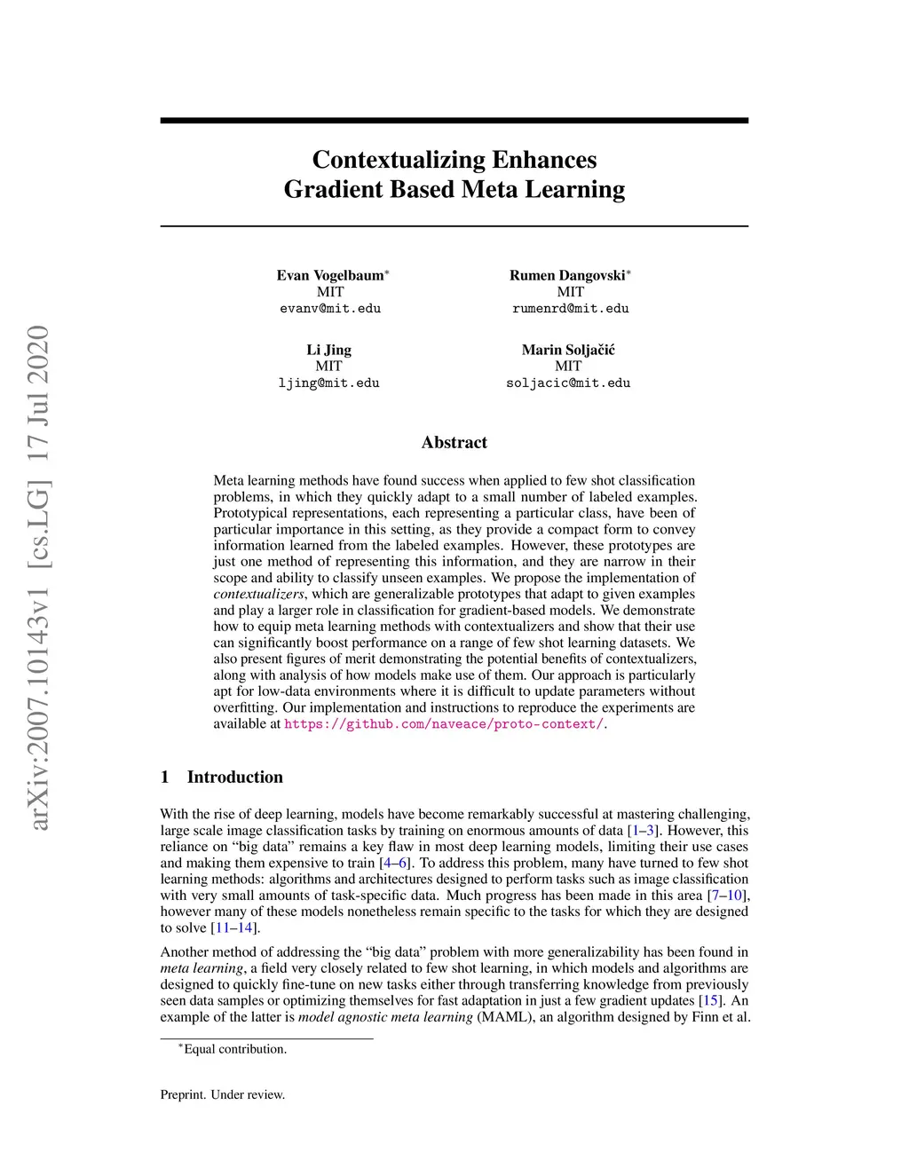 Meta learning methods have found success when applied to few shot classification problems, in which they quickly adapt to a small number of labeled examples. Prototypical representations, each representing a particular class, have been of particular importance in this setting, as they provide a compact form to convey information learned from the labeled examples. However, these prototypes are just one method of representing this information, and they are narrow in their scope and ability to classify unseen examples. We propose the implementation of contextualizers, which are generalizable prototypes that adapt to given examples and play a larger role in classification for gradient-based models. We demonstrate how to equip meta learning methods with contextualizers and show that their use can significantly boost performance on a range of few shot learning datasets. We also present figures of merit demonstrating the potential benefits of contextualizers, along with analysis of how models make use of them. Our approach is particularly apt for low-data environments where it is difficult to update parameters without overfitting. Our implementation and instructions to reproduce the experiments are available at https://github.com/naveace/proto-context.