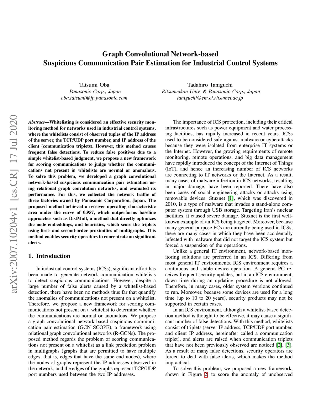 Whitelisting is considered an effective security monitoring method for networks used in industrial control systems, where the whitelists consist of observed tuples of the IP address of the server, the TCP/UDP port number, and IP address of the client (communication triplets). However, this method causes frequent false detections. To reduce false positives due to a simple whitelist-based judgment, we propose a new framework for scoring communications to judge whether the communications not present in whitelists are normal or anomalous. To solve this problem, we developed a graph convolutional network-based suspicious communication pair estimation using relational graph convolution networks, and evaluated its performance. For this, we collected the network traffic of three factories owned by Panasonic Corporation, Japan. The proposed method achieved a receiver operating characteristic area under the curve of 0.957, which outperforms baseline approaches such as DistMult, a method that directly optimizes the node embeddings, and heuristics, which score the triplets using first- and second-order proximities of multigraphs. This method enables security operators to concentrate on significant alerts.