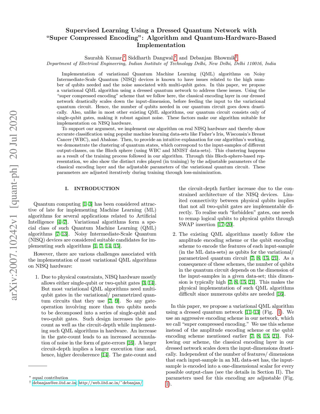Implementation of variational Quantum Machine Learning (QML) algorithms on Noisy Intermediate-Scale Quantum (NISQ) devices is known to have issues related to the high number of qubits needed and the noise associated with multi-qubit gates. In this paper, we propose a variational QML algorithm using a dressed quantum network to address these issues. Using the "super compressed encoding" scheme that we follow here, the classical encoding layer in our dressed network drastically scales down the input-dimension, before feeding the input to the variational quantum circuit. Hence, the number of qubits needed in our quantum circuit goes down drastically. Also, unlike in most other existing QML algorithms, our quantum circuit consists only of single-qubit gates, making it robust against noise. These factors make our algorithm suitable for implementation on NISQ hardware. To support our argument, we implement our algorithm on real NISQ hardware and thereby show accurate classification using popular machine learning data-sets like Fisher's Iris, Wisconsin's Breast Cancer (WBC), and Abalone. Then, to provide an intuitive explanation for our algorithm's working, we demonstrate the clustering of quantum states, which correspond to the input-samples of different output-classes, on the Bloch sphere (using WBC and MNIST data-sets). This clustering happens as a result of the training process followed in our algorithm. Through this Bloch-sphere-based representation, we also show the distinct roles played (in training) by the adjustable parameters of the classical encoding layer and the adjustable parameters of the variational quantum circuit. These parameters are adjusted iteratively during training through loss-minimization.