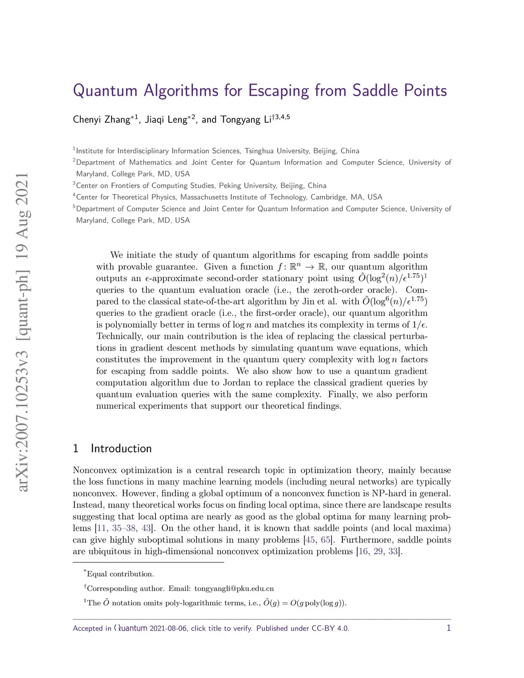 We initiate the study of quantum algorithms for escaping from saddle points with provable guarantee. Given a function , our quantum algorithm outputs an -approximate second-order stationary point using queries to the quantum evaluation oracle (i.e., the zeroth-order oracle). Compared to the classical state-of-the-art algorithm by Jin et al. with queries to the gradient oracle (i.e., the first-order oracle), our quantum algorithm is polynomially better in terms of and matches its complexity in terms of . Technically, our main contribution is the idea of replacing the classical perturbations in gradient descent methods by simulating quantum wave equations, which constitutes the improvement in the quantum query complexity with factors for escaping from saddle points. We also show how to use a quantum gradient computation algorithm due to Jordan to replace the classical gradient queries by quantum evaluation queries with the same complexity. Finally, we also perform numerical experiments that support our theoretical findings.