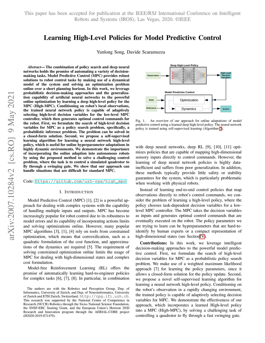 The combination of policy search and deep neural networks holds the promise of automating a variety of decision-making tasks. Model Predictive Control (MPC) provides robust solutions to robot control tasks by making use of a dynamical model of the system and solving an optimization problem online over a short planning horizon. In this work, we leverage probabilistic decision-making approaches and the generalization capability of artificial neural networks to the powerful online optimization by learning a deep high-level policy for the MPC (High-MPC). Conditioning on robot's local observations, the trained neural network policy is capable of adaptively selecting high-level decision variables for the low-level MPC controller, which then generates optimal control commands for the robot. First, we formulate the search of high-level decision variables for MPC as a policy search problem, specifically, a probabilistic inference problem. The problem can be solved in a closed-form solution. Second, we propose a self-supervised learning algorithm for learning a neural network high-level policy, which is useful for online hyperparameter adaptations in highly dynamic environments. We demonstrate the importance of incorporating the online adaption into autonomous robots by using the proposed method to solve a challenging control problem, where the task is to control a simulated quadrotor to fly through a swinging gate. We show that our approach can handle situations that are difficult for standard MPC.