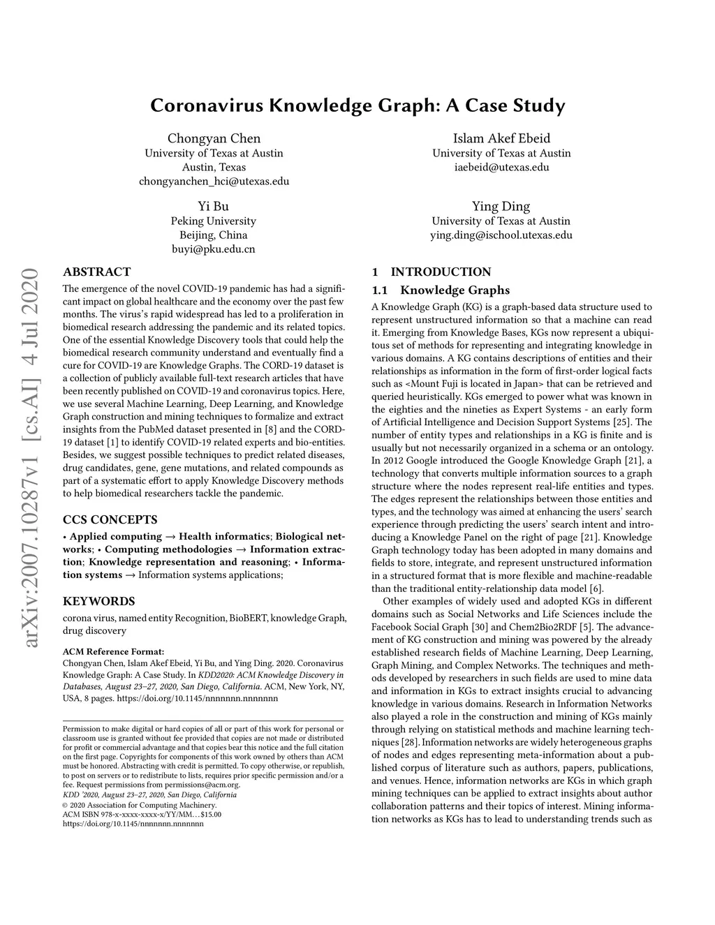 The emergence of the novel COVID-19 pandemic has had a significant impact on global healthcare and the economy over the past few months. The virus's rapid widespread has led to a proliferation in biomedical research addressing the pandemic and its related topics. One of the essential Knowledge Discovery tools that could help the biomedical research community understand and eventually find a cure for COVID-19 are Knowledge Graphs. The CORD-19 dataset is a collection of publicly available full-text research articles that have been recently published on COVID-19 and coronavirus topics. Here, we use several Machine Learning, Deep Learning, and Knowledge Graph construction and mining techniques to formalize and extract insights from the PubMed dataset and the CORD-19 dataset to identify COVID-19 related experts and bio-entities. Besides, we suggest possible techniques to predict related diseases, drug candidates, gene, gene mutations, and related compounds as part of a systematic effort to apply Knowledge Discovery methods to help biomedical researchers tackle the pandemic.