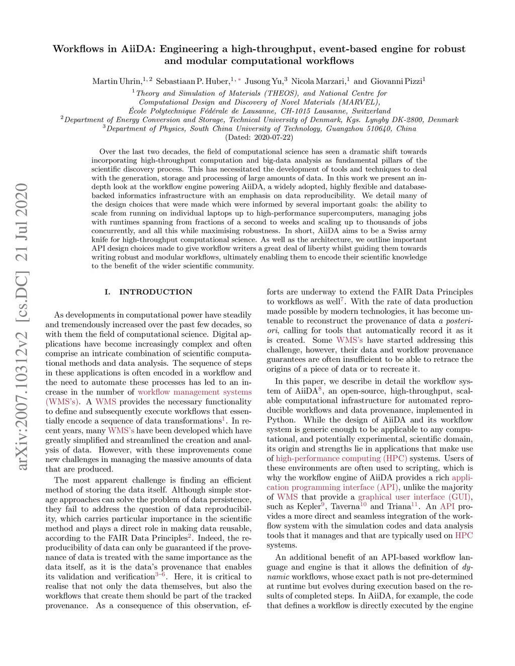 Over the last two decades, the field of computational science has seen a dramatic shift towards incorporating high-throughput computation and big-data analysis as fundamental pillars of the scientific discovery process. This has necessitated the development of tools and techniques to deal with the generation, storage and processing of large amounts of data. In this work we present an in-depth look at the workflow engine powering AiiDA, a widely adopted, highly flexible and database-backed informatics infrastructure with an emphasis on data reproducibility. We detail many of the design choices that were made which were informed by several important goals: the ability to scale from running on individual laptops up to high-performance supercomputers, managing jobs with runtimes spanning from fractions of a second to weeks and scaling up to thousands of jobs concurrently, and all this while maximising robustness. In short, AiiDA aims to be a Swiss army knife for high-throughput computational science. As well as the architecture, we outline important API design choices made to give workflow writers a great deal of liberty whilst guiding them towards writing robust and modular workflows, ultimately enabling them to encode their scientific knowledge to the benefit of the wider scientific community.