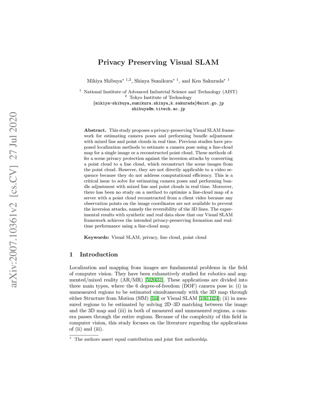 This study proposes a privacy-preserving Visual SLAM framework for estimating camera poses and performing bundle adjustment with mixed line and point clouds in real time. Previous studies have proposed localization methods to estimate a camera pose using a line-cloud map for a single image or a reconstructed point cloud. These methods offer a scene privacy protection against the inversion attacks by converting a point cloud to a line cloud, which reconstruct the scene images from the point cloud. However, they are not directly applicable to a video sequence because they do not address computational efficiency. This is a critical issue to solve for estimating camera poses and performing bundle adjustment with mixed line and point clouds in real time. Moreover, there has been no study on a method to optimize a line-cloud map of a server with a point cloud reconstructed from a client video because any observation points on the image coordinates are not available to prevent the inversion attacks, namely the reversibility of the 3D lines. The experimental results with synthetic and real data show that our Visual SLAM framework achieves the intended privacy-preserving formation and real-time performance using a line-cloud map.