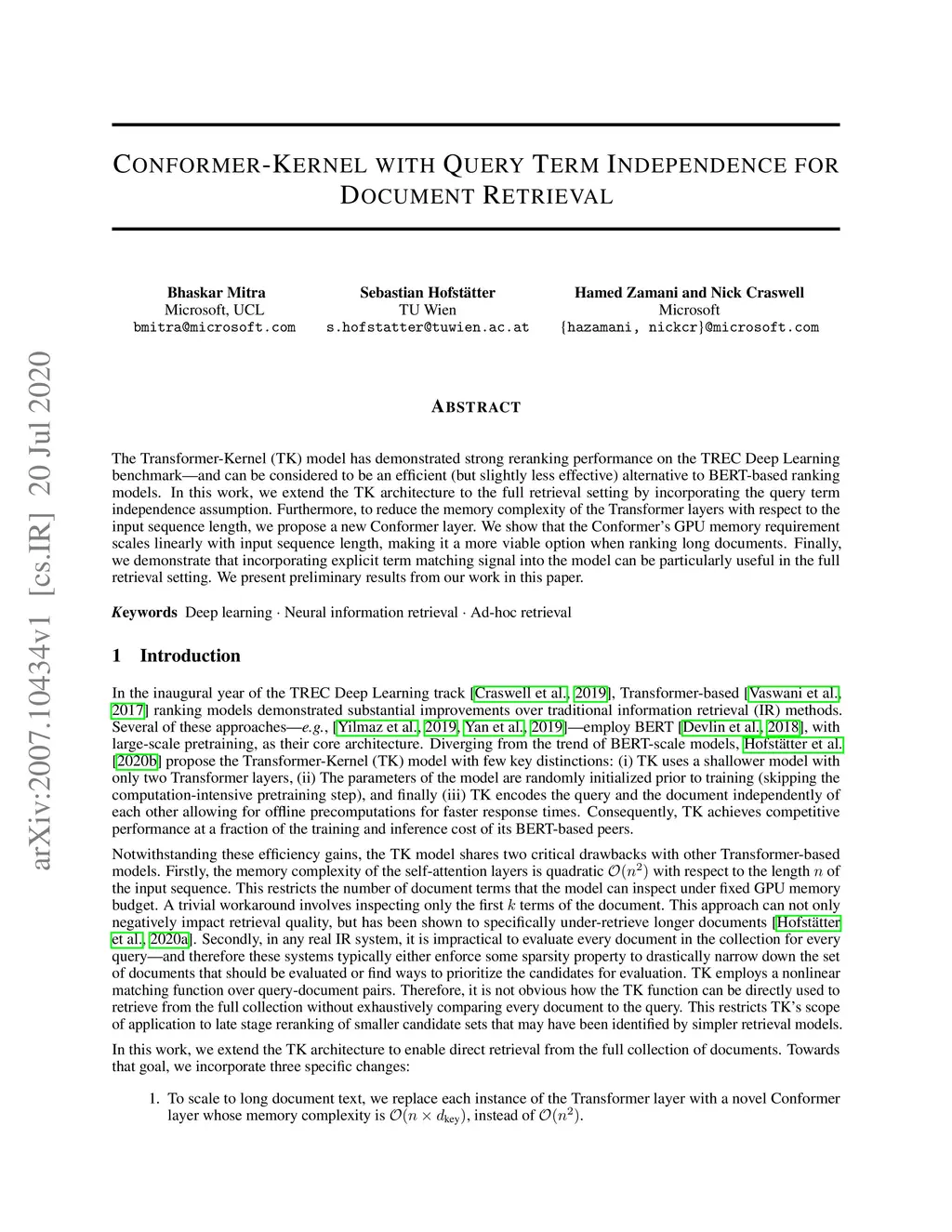 The Transformer-Kernel (TK) model has demonstrated strong reranking performance on the TREC Deep Learning benchmark---and can be considered to be an efficient (but slightly less effective) alternative to BERT-based ranking models. In this work, we extend the TK architecture to the full retrieval setting by incorporating the query term independence assumption. Furthermore, to reduce the memory complexity of the Transformer layers with respect to the input sequence length, we propose a new Conformer layer. We show that the Conformer's GPU memory requirement scales linearly with input sequence length, making it a more viable option when ranking long documents. Finally, we demonstrate that incorporating explicit term matching signal into the model can be particularly useful in the full retrieval setting. We present preliminary results from our work in this paper.