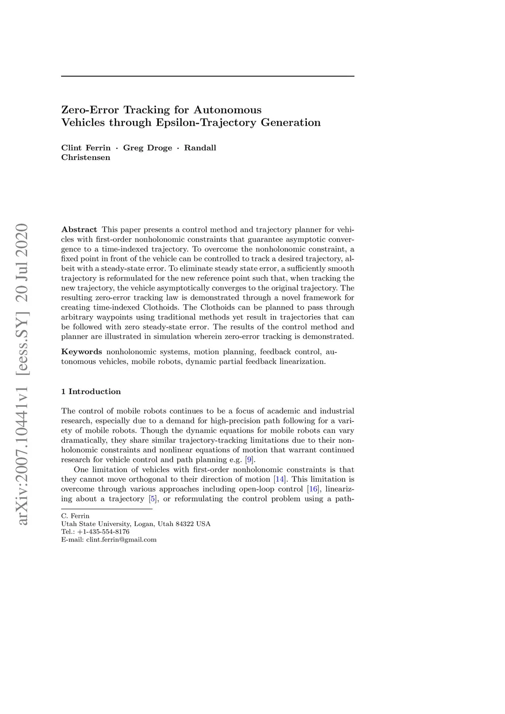 This paper presents a control method and trajectory planner for vehicles with first-order nonholonomic constraints that guarantee asymptotic convergence to a time-indexed trajectory. To overcome the nonholonomic constraint, a fixed point in front of the vehicle can be controlled to track a desired trajectory, albeit with a steady-state error. To eliminate steady state error, a sufficiently smooth trajectory is reformulated for the new reference point such that, when tracking the new trajectory, the vehicle asymptotically converges to the original trajectory. The resulting zero-error tracking law is demonstrated through a novel framework for creating time-indexed Clothoids. The Clothoids can be planned to pass through arbitrary waypoints using traditional methods yet result in trajectories that can be followed with zero steady-state error. The results of the control method and planner are illustrated in simulation wherein zero-error tracking is demonstrated.
